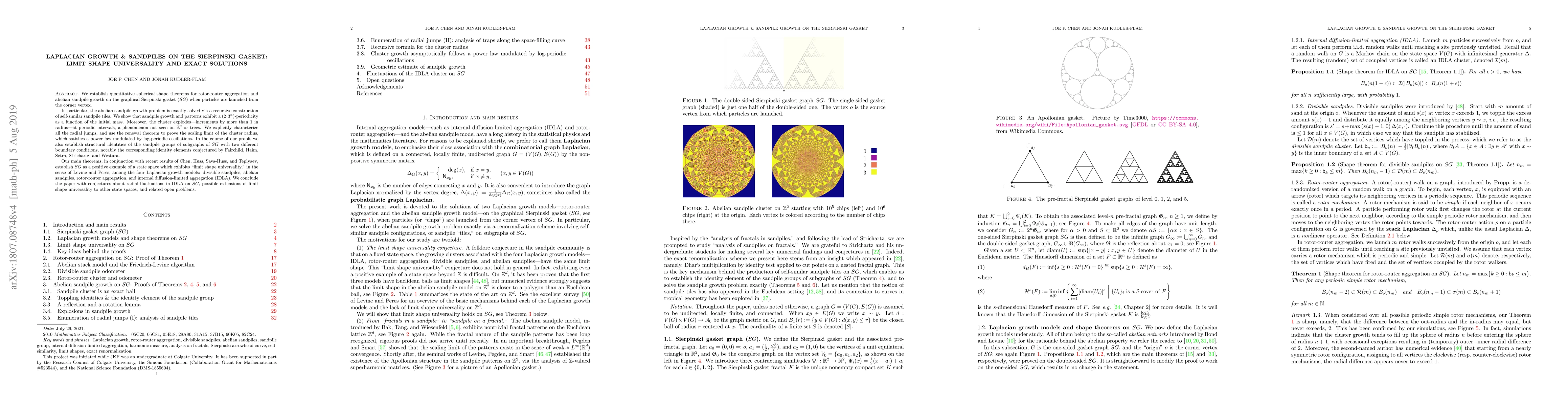 This paper establishes quantitative spherical shape theorems for rotor-router aggregation and abelian sandpile growth on the Sierpinski gasket, proving exact solutions for sandpile growth and characterizing its $(2\cdot 3^n)$-periodicity. It also explores the phenomenon of radial jumps and the cluster explosion, establishing "limit shape universality" for the Sierpinski gasket among various Laplacian growth models.