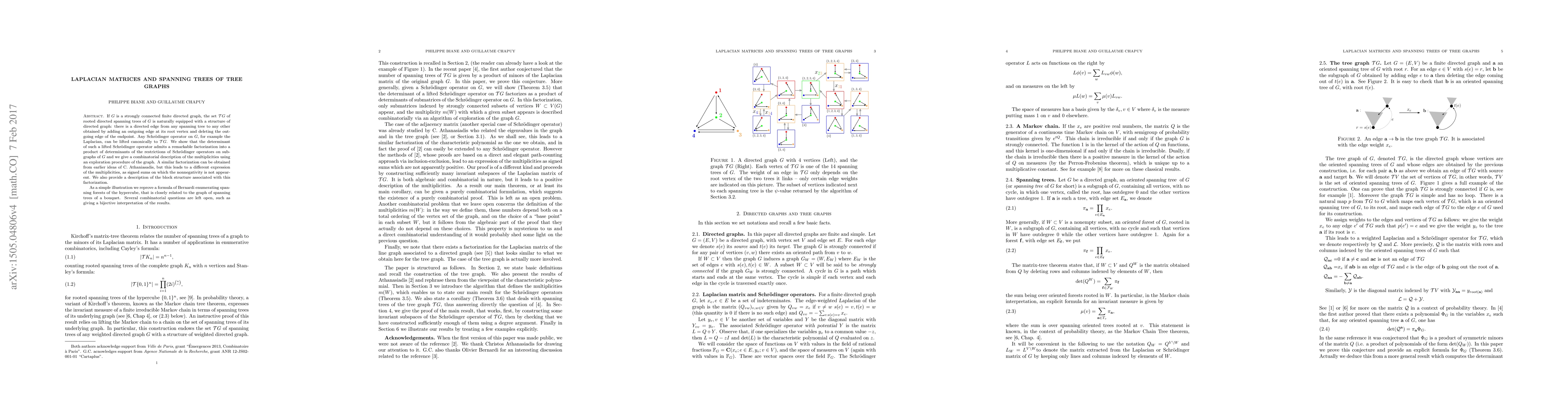 If $G$ is a strongly connected finite directed graph, the set $\mathcal{T}G$ of rooted directed spanning trees of $G$ is naturally equipped with a structure of directed graph: there is a directed edge from any spanning tree to any other obtained by adding an outgoing edge at its root vertex and deleting the outgoing edge of the endpoint. Any Schr\"odinger operator on $G$, for example the Laplacian, can be lifted canonically to $\mathcal{T}G$. We show that the determinant of such a lifted Schr\"odinger operator admits a remarkable factorization into a product of determinants of the restrictions of Schr\"odinger operators on subgraphs of $G$ and we give a combinatorial description of the multiplicities using an exploration procedure of the graph. A similar factorization can be obtained from earlier ideas of C. Athaniasadis, but this leads to a different expression of the multiplicities, as signed sums on which the nonnegativity is not appearent. We also provide a description of the block structure associated with this factorization. As a simple illustration we reprove a formula of Bernardi enumerating spanning forests of the hypercube, that is closely related to the graph of spanning trees of a bouquet. Several combinatorial questions are left open, such as giving a bijective interpretation of the results.