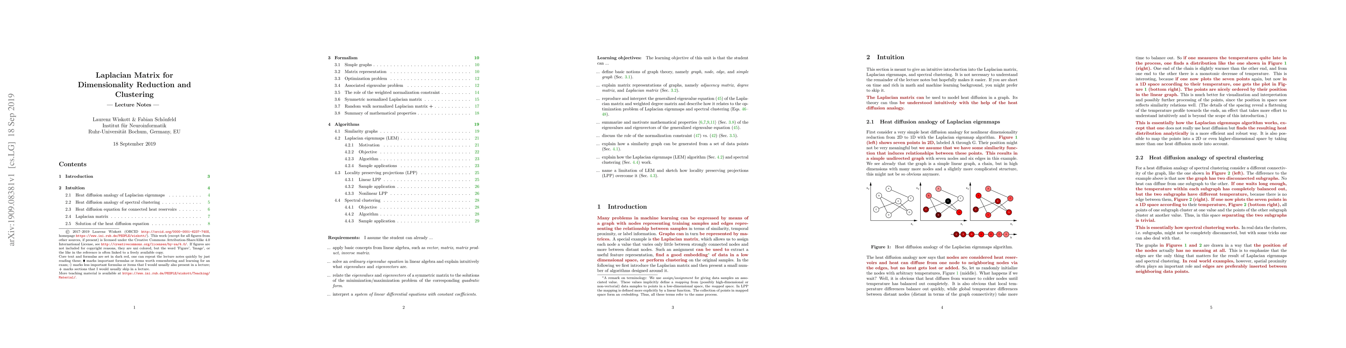 Many problems in machine learning can be expressed by means of a graph with nodes representing training samples and edges representing the relationship between samples in terms of similarity, temporal proximity, or label information. Graphs can in turn be represented by matrices. A special example is the Laplacian matrix, which allows us to assign each node a value that varies only little between strongly connected nodes and more between distant nodes. Such an assignment can be used to extract a useful feature representation, find a good embedding of data in a low dimensional space, or perform clustering on the original samples. In these lecture notes we first introduce the Laplacian matrix and then present a small number of algorithms designed around it.