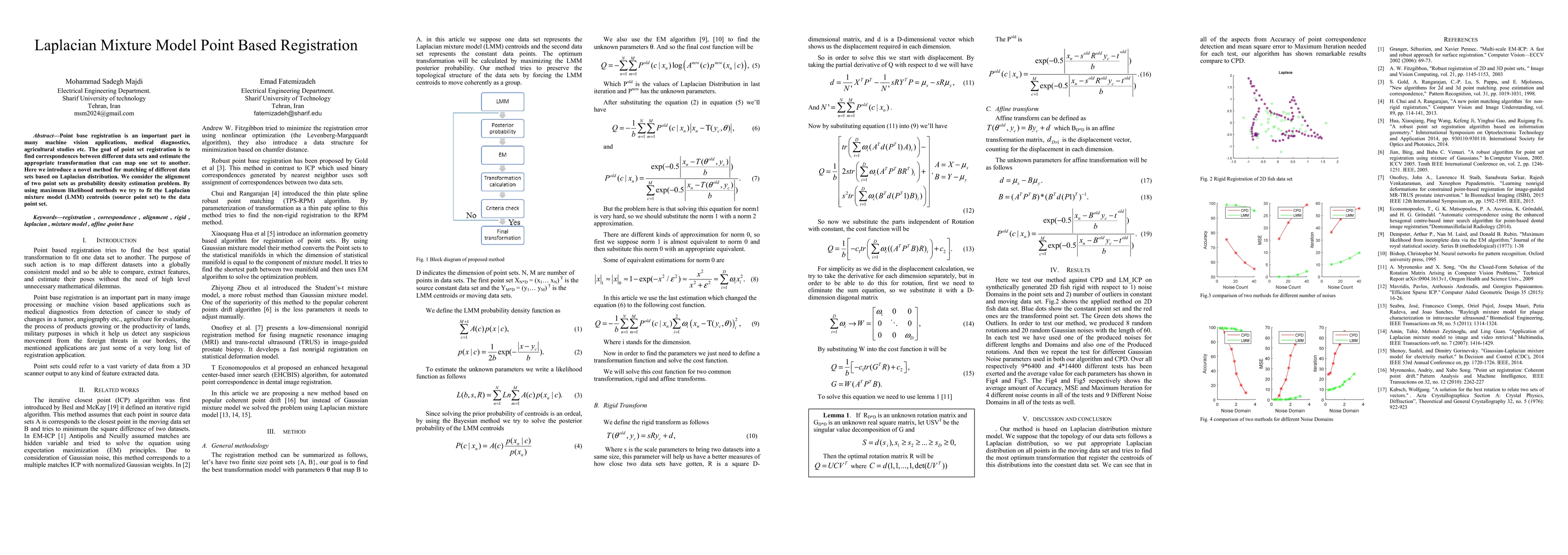 Point base registration is an important part in many machine VISIOn applications, medical diagnostics, agricultural studies etc. The goal of point set registration is to find correspondences between different data sets and estimate the appropriate transformation that can map one set to another. Here we introduce a novel method for matching of different data sets based on Laplacian distribution. We consider the alignment of two point sets as probability density estimation problem. By using maximum likelihood methods we try to fit the Laplacian mixture model (LMM) centroids (source point set) to the data point set.
