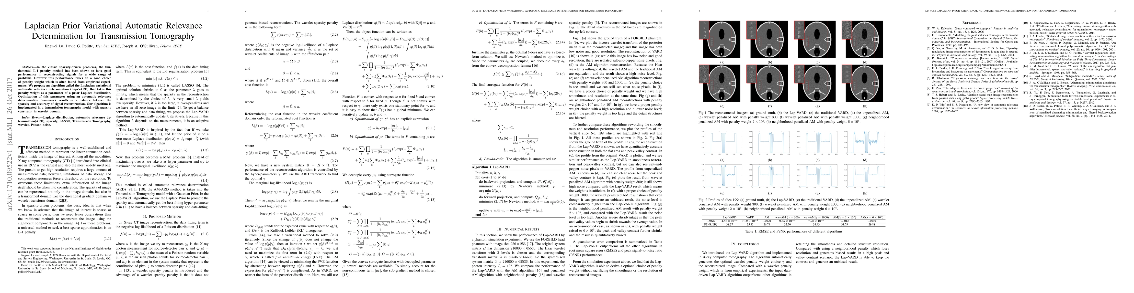 This paper proposes a Laplacian variational automatic relevance determination (Lap-VARD) algorithm to optimize the penalty weight in L-1 penalty-based reconstruction, balancing sparsity and accuracy in signal reconstruction. The method is applied to transmission tomography with sparsity constraints in the wavelet domain.