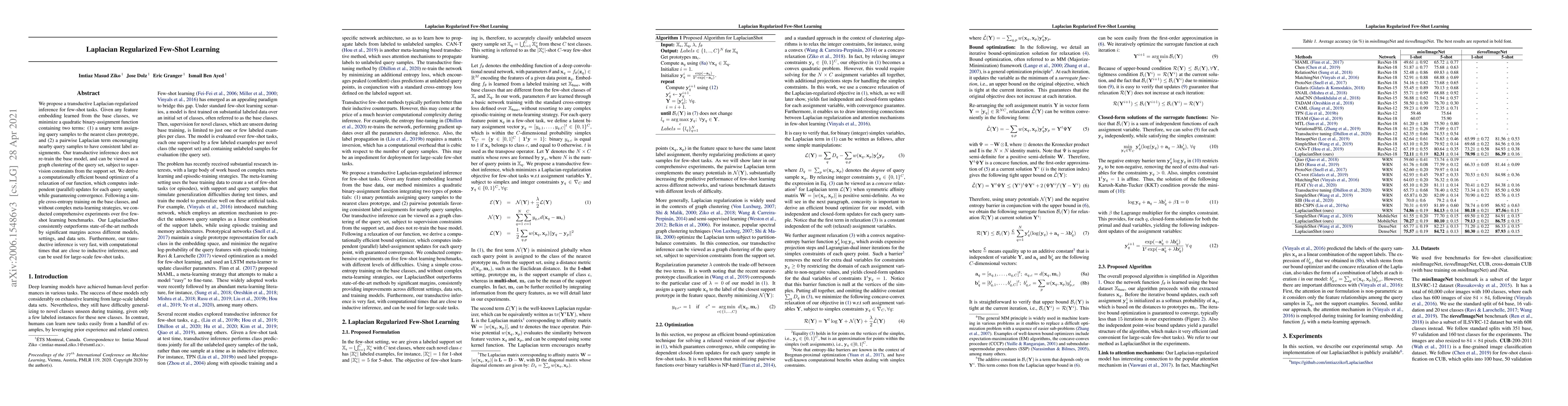 We propose a transductive Laplacian-regularized inference for few-shot tasks. Given any feature embedding learned from the base classes, we minimize a quadratic binary-assignment function containing two terms: (1) a unary term assigning query samples to the nearest class prototype, and (2) a pairwise Laplacian term encouraging nearby query samples to have consistent label assignments. Our transductive inference does not re-train the base model, and can be viewed as a graph clustering of the query set, subject to supervision constraints from the support set. We derive a computationally efficient bound optimizer of a relaxation of our function, which computes independent (parallel) updates for each query sample, while guaranteeing convergence. Following a simple cross-entropy training on the base classes, and without complex meta-learning strategies, we conducted comprehensive experiments over five few-shot learning benchmarks. Our LaplacianShot consistently outperforms state-of-the-art methods by significant margins across different models, settings, and data sets. Furthermore, our transductive inference is very fast, with computational times that are close to inductive inference, and can be used for large-scale few-shot tasks.