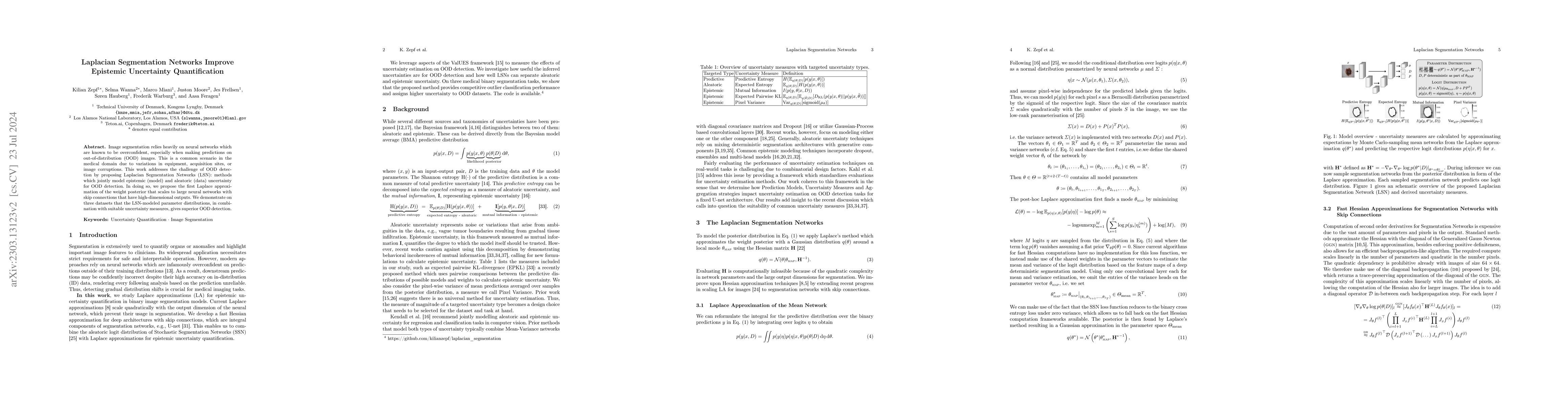 Out of distribution (OOD) medical images are frequently encountered, e.g. because of site- or scanner differences, or image corruption. OOD images come with a risk of incorrect image segmentation, potentially negatively affecting downstream diagnoses or treatment. To ensure robustness to such incorrect segmentations, we propose Laplacian Segmentation Networks (LSN) that jointly model epistemic (model) and aleatoric (data) uncertainty in image segmentation. We capture data uncertainty with a spatially correlated logit distribution. For model uncertainty, we propose the first Laplace approximation of the weight posterior that scales to large neural networks with skip connections that have high-dimensional outputs. Empirically, we demonstrate that modelling spatial pixel correlation allows the Laplacian Segmentation Network to successfully assign high epistemic uncertainty to out-of-distribution objects appearing within images.