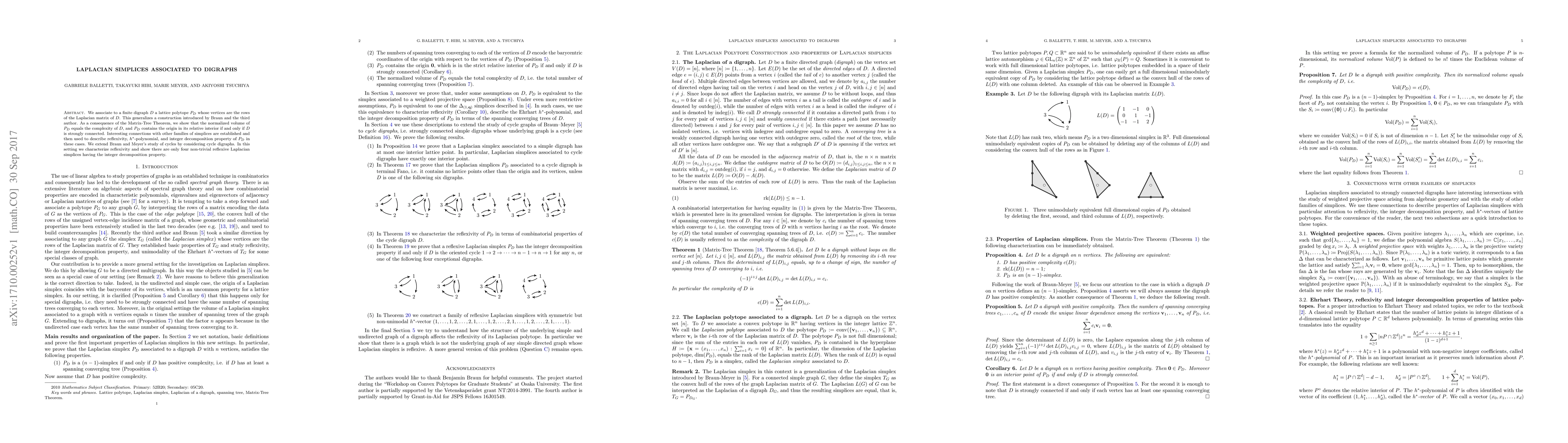 We associate to a finite digraph $D$ a lattice polytope $P_D$ whose vertices are the rows of the Laplacian matrix of $D$. This generalizes a construction introduced by Braun and the third author. As a consequence of the Matrix-Tree Theorem, we show that the normalized volume of $P_D$ equals the complexity of $D$, and $P_D$ contains the origin in its relative interior if and only if $D$ is strongly connected. Interesting connections with other families of simplices are established and then used to describe reflexivity, $h^*$-polynomial, and integer decomposition property of $P_D$ in these cases. We extend Braun and Meyer's study of cycles by considering cycle digraphs. In this setting we characterize reflexivity and show there are only four non-trivial reflexive Laplacian simplices having the integer decomposition property.