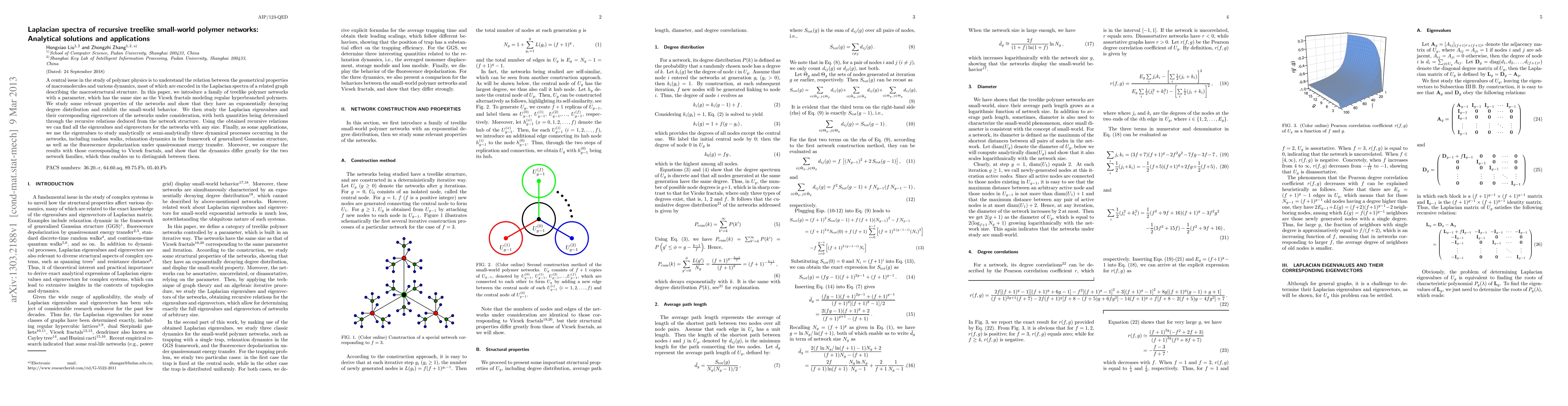 This paper investigates the Laplacian spectra of recursive treelike small-world polymer networks, deriving analytical solutions for their eigenvalues and eigenvectors. It applies these findings to analyze dynamic processes such as random walks and fluorescence depolarization, demonstrating distinct dynamical behaviors compared to Vicsek fractals.