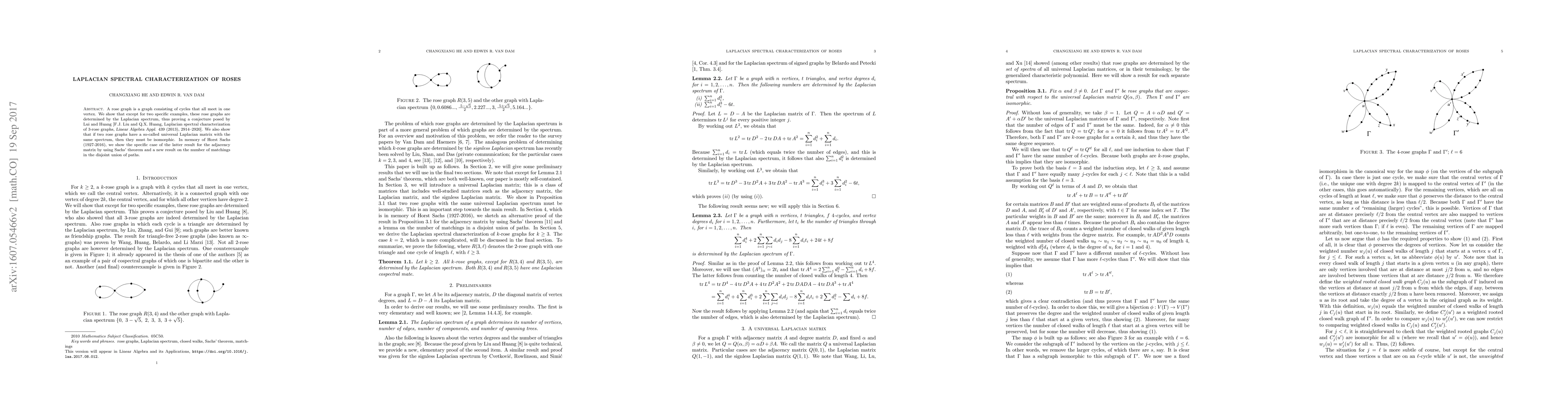 A rose graph is a graph consisting of cycles that all meet in one vertex. We show that except for two specific examples, these rose graphs are determined by the Laplacian spectrum, thus proving a conjecture posed by Lui and Huang [F.J. Liu and Q.X. Huang, Laplacian spectral characterization of 3-rose graphs, Linear Algebra Appl. 439 (2013), 2914--2920]. We also show that if two rose graphs have a so-called universal Laplacian matrix with the same spectrum, then they must be isomorphic. In memory of Horst Sachs (1927-2016), we show the specific case of the latter result for the adjacency matrix by using Sachs' theorem and a new result on the number of matchings in the disjoint union of paths.