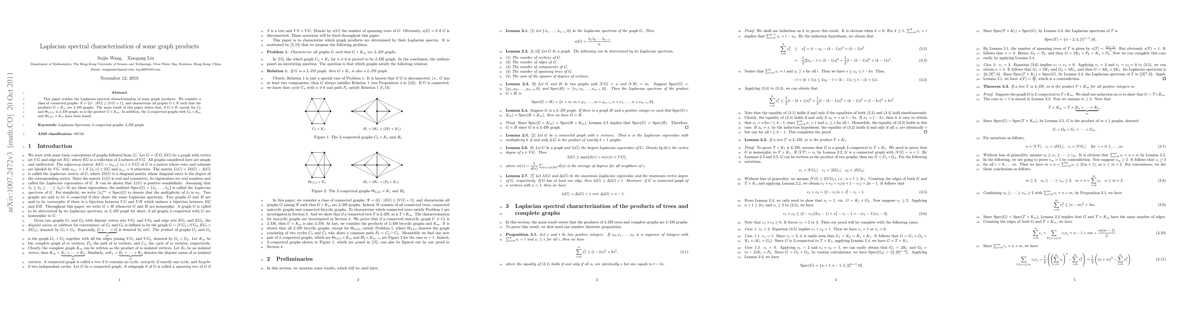 This paper studies graph products and finds that most graphs in a specific class are L-spectral if their product with K_m is also L-spectral, except for two exceptions.