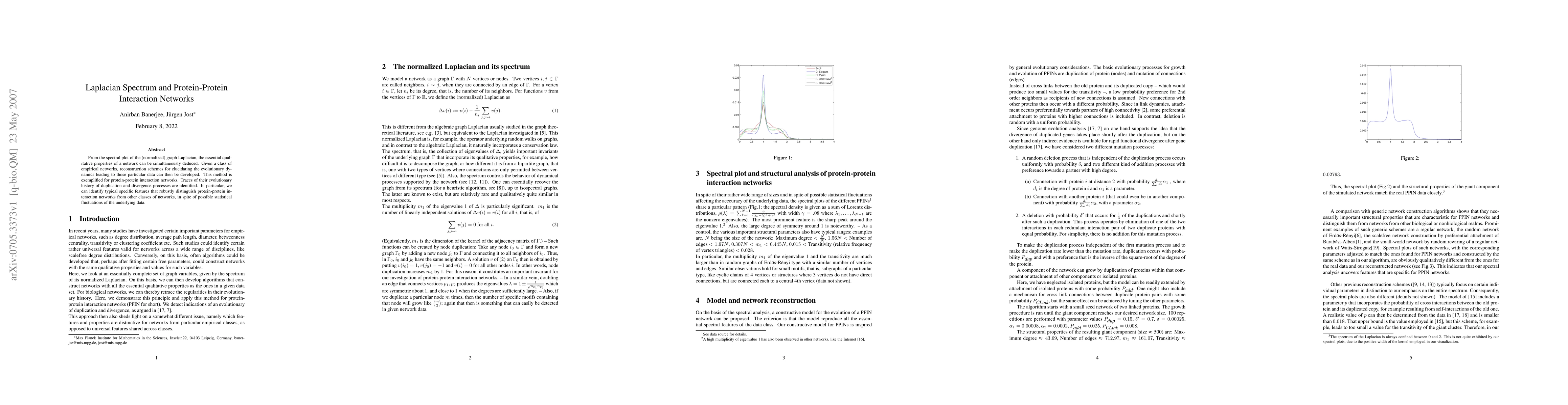 This paper explores the use of the Laplacian spectrum of normalized graph Laplacians to deduce qualitative properties of protein-protein interaction networks. It identifies evolutionary dynamics and specific features distinguishing these networks from others, revealing traces of duplication and divergence processes.