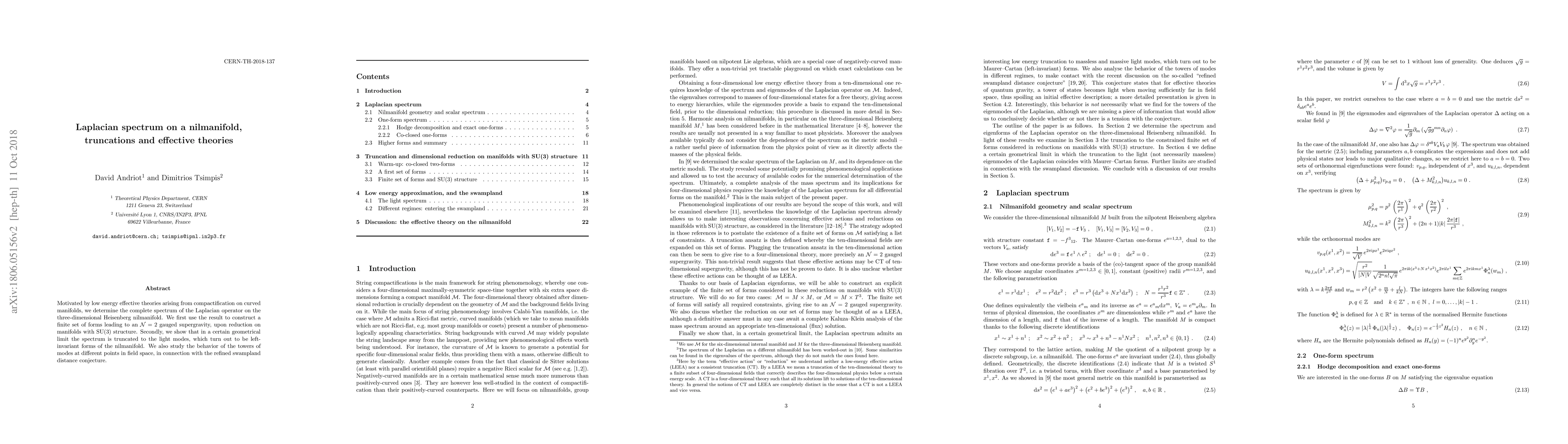 Motivated by low energy effective theories arising from compactification on curved manifolds, we determine the complete spectrum of the Laplacian operator on the three-dimensional Heisenberg nilmanifold. We first use the result to construct a finite set of forms leading to an N=2 gauged supergravity, upon reduction on manifolds with SU(3) structure. Secondly, we show that in a certain geometrical limit the spectrum is truncated to the light modes, which turn out to be left-invariant forms of the nilmanifold. We also study the behavior of the towers of modes at different points in field space, in connection with the refined swampland distance conjecture.