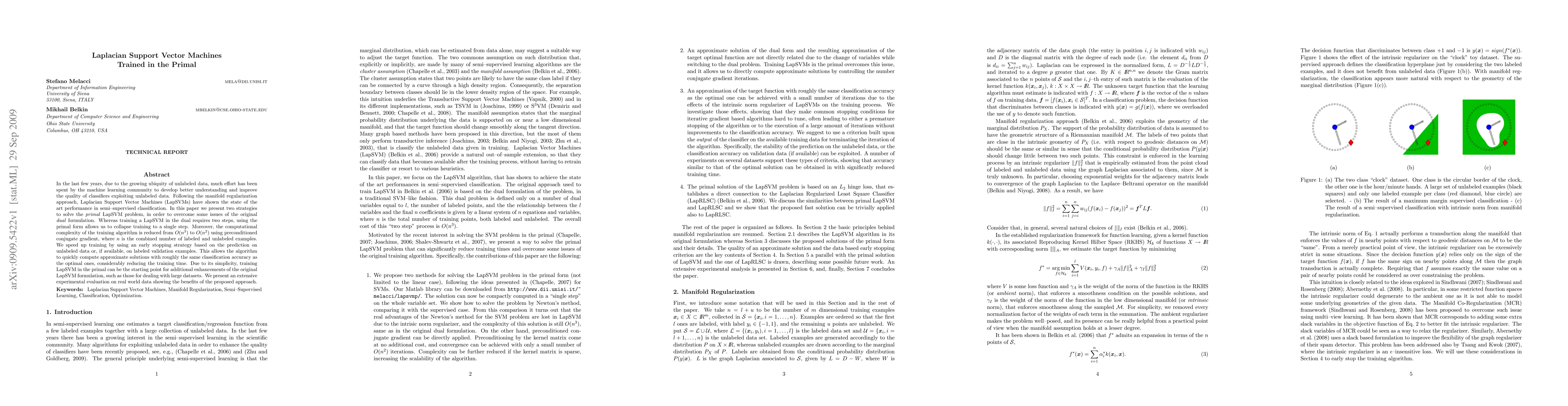 This paper proposes two strategies to solve the primal formulation of Laplacian Support Vector Machines (LapSVMs), reducing training complexity from O(n^3) to O(n^2) and collapsing training into a single step. An early stopping strategy is also introduced to further speed up training while maintaining classification accuracy.