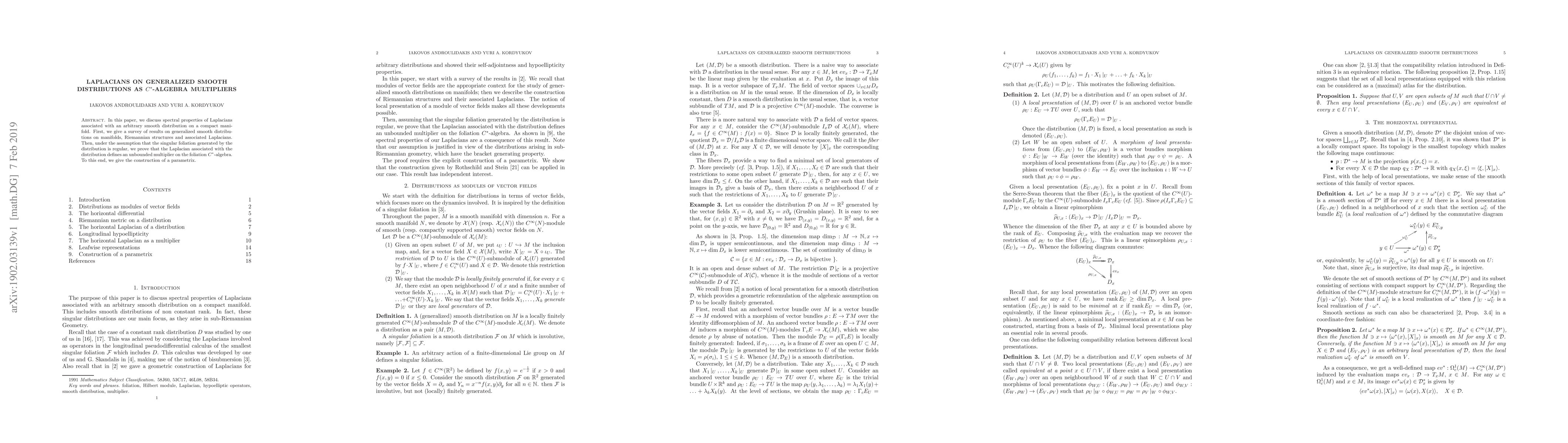 In this paper, we discuss spectral properties of Laplacians associated with an arbitrary smooth distribution on a compact manifold. First, we give a survey of results on generalized smooth distributions on manifolds, Riemannian structures and associated Laplacians. Then, under the assumption that the singular foliation generated by the distribution is regular, we prove that the Laplacian associated with the distribution defines an unbounded multiplier on the foliation $C^*$-algebra. To this end, we give the construction of a parametrix.