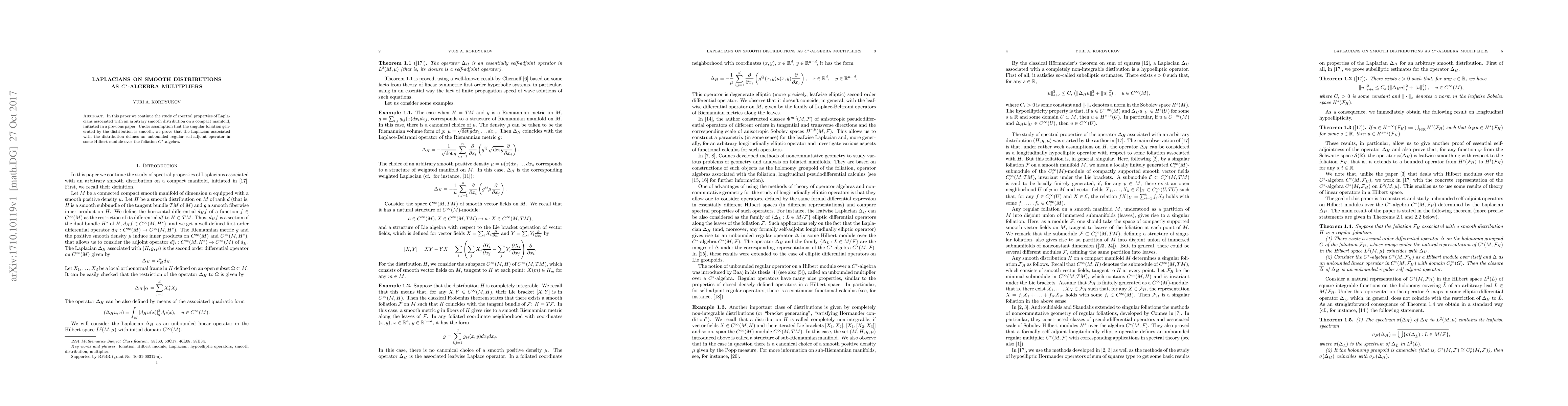 In this paper we continue the study of spectral properties of Laplacians associated with an arbitrary smooth distribution on a compact manifold, initiated in a previous paper. Under assumption that the singular foliation generated by the distribution is smooth, we prove that the Laplacian associated with the distribution defines an unbounded regular self-adjoint operator in some Hilbert module over the foliation $C^*$-algebra.