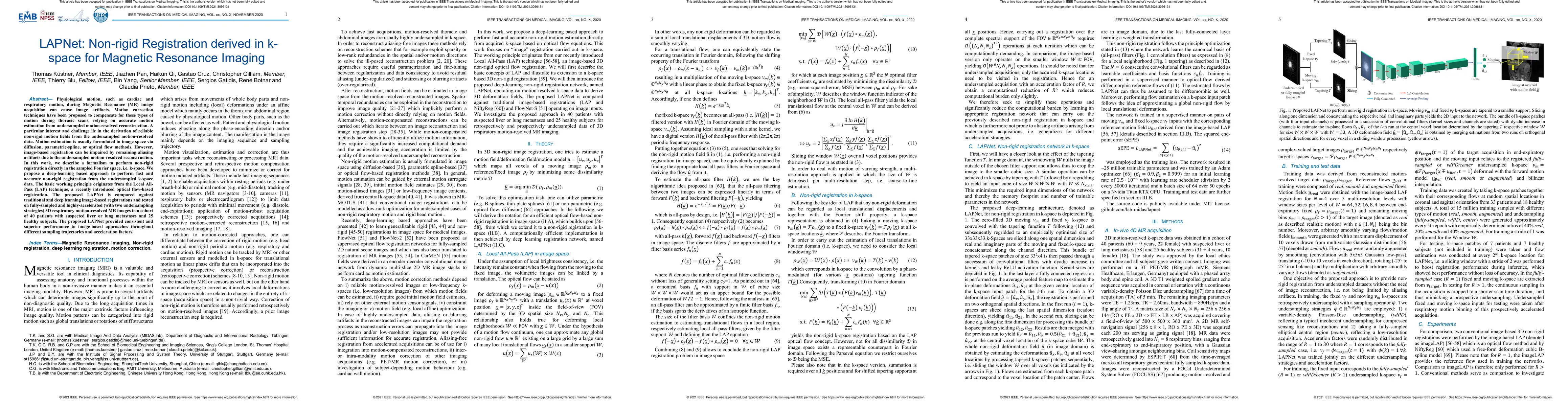 LAPNet proposes a deep-learning method for non-rigid registration in k-space to correct physiological motion artifacts in MR imaging, outperforming traditional image-based registration techniques. The method leverages the Local All-Pass technique for accurate motion field estimation from undersampled k-space data.