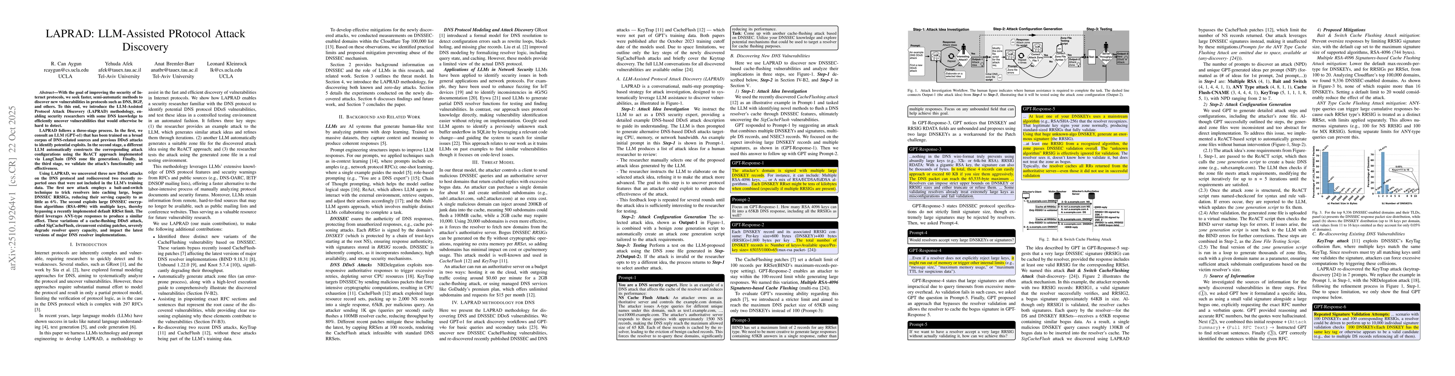 With the goal of improving the security of Internet protocols, we seek faster, semi-automatic methods to discover new vulnerabilities in protocols such as DNS, BGP, and others. To this end, we introduce the LLM-Assisted Protocol Attack Discovery (LAPRAD) methodology, enabling security researchers with some DNS knowledge to efficiently uncover vulnerabilities that would otherwise be hard to detect. LAPRAD follows a three-stage process. In the first, we consult an LLM (GPT-o1) that has been trained on a broad corpus of DNS-related sources and previous DDoS attacks to identify potential exploits. In the second stage, a different LLM automatically constructs the corresponding attack configurations using the ReACT approach implemented via LangChain (DNS zone file generation). Finally, in the third stage, we validate the attack's functionality and effectiveness. Using LAPRAD, we uncovered three new DDoS attacks on the DNS protocol and rediscovered two recently reported ones that were not included in the LLM's training data. The first new attack employs a bait-and-switch technique to trick resolvers into caching large, bogus DNSSEC RRSIGs, reducing their serving capacity to as little as 6%. The second exploits large DNSSEC encryption algorithms (RSA-4096) with multiple keys, thereby bypassing a recently implemented default RRSet limit. The third leverages ANY-type responses to produce a similar effect. These variations of a cache-flushing DDoS attack, called SigCacheFlush, circumvent existing patches, severely degrade resolver query capacity, and impact the latest versions of major DNS resolver implementations.