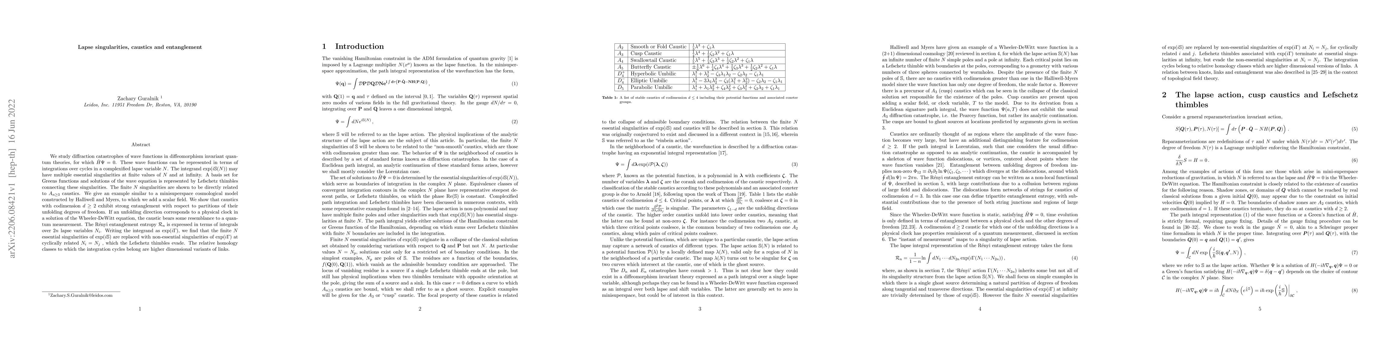We study diffraction catastrophes of wave functions in diffeomorphism invariant quantum theories, for which $\hat H\Psi=0$. These wave functions can be represented in terms of integrations over cycles in a complexified lapse variable $N$. The integrand $\exp(i{\mathbb S}(N))$ may have multiple essential singularities at finite values of $N$ and at infinity. A basis set for Greens functions and solutions of the wave equation is represented by Lefschetz thimbles connecting these singularities. The finite $N$ singularities are shown to be directly related to $A_{n\ge 3}$ caustics. We give an example similar to a minisuperspace cosmological model constructed by Halliwell and Myers, to which we add a scalar field. We show that caustics with codimension $d\ge 2$ exhibit strong entanglement with respect to partitions of their unfolding degrees of freedom. If an unfolding direction corresponds to a physical clock in a solution of the Wheeler-DeWitt equation, the caustic bears some resemblance to a quantum measurement. The R\'enyi entanglement entropy ${\cal R}_n$ is expressed in terms of integrals over $2n$ lapse variables $N_i$. Writing the integrand as $\exp(i\Gamma)$, we find that the finite $N$ essential singularities of $\exp(i{\mathbb S})$ are replaced with non-essential singularities of $\exp(i\Gamma)$ at cyclically related $N_i = N_j$ , which the Lefschetz thimbles evade. The relative homology classes to which the integration cycles belong are higher dimensional variants of links.