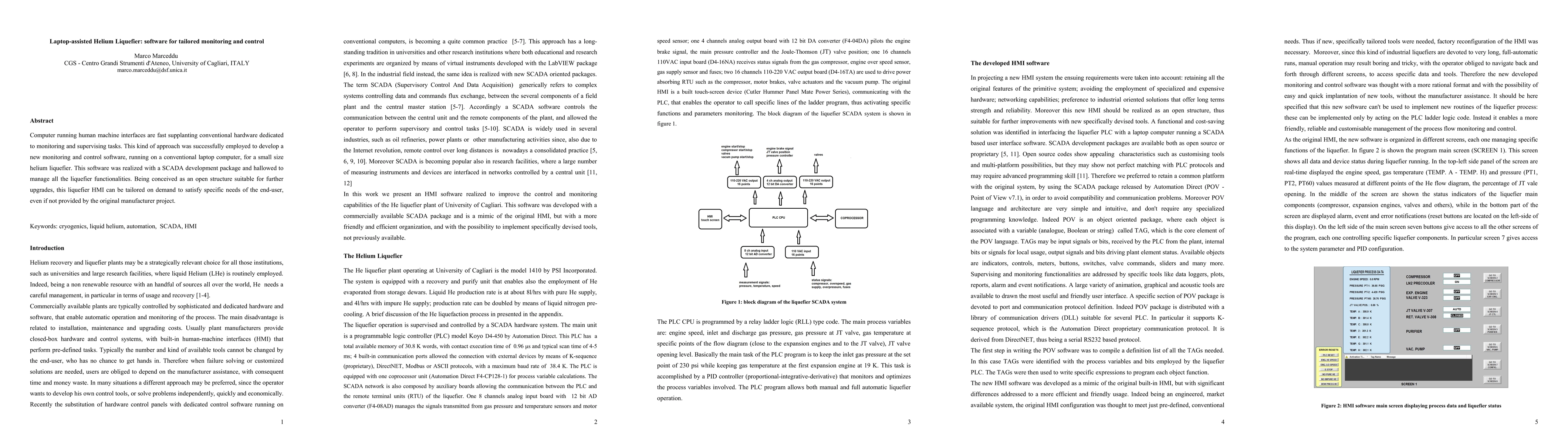 Computer running human machine interfaces are fast supplanting conventional hardware dedicated to monitoring and supervising tasks. This kind of approach was successfully employed to develop a new monitoring and control software, running on a conventional laptop computer, for a small size helium liquefier. This software was realized with a SCADA development package and hallowed to manage all the liquefier functionalities. Being conceived as an open structure suitable for further upgrades, this liquefier HMI can be tailored on demand to satisfy specific needs of the end-user, even if not provided by the original manufacturer project.