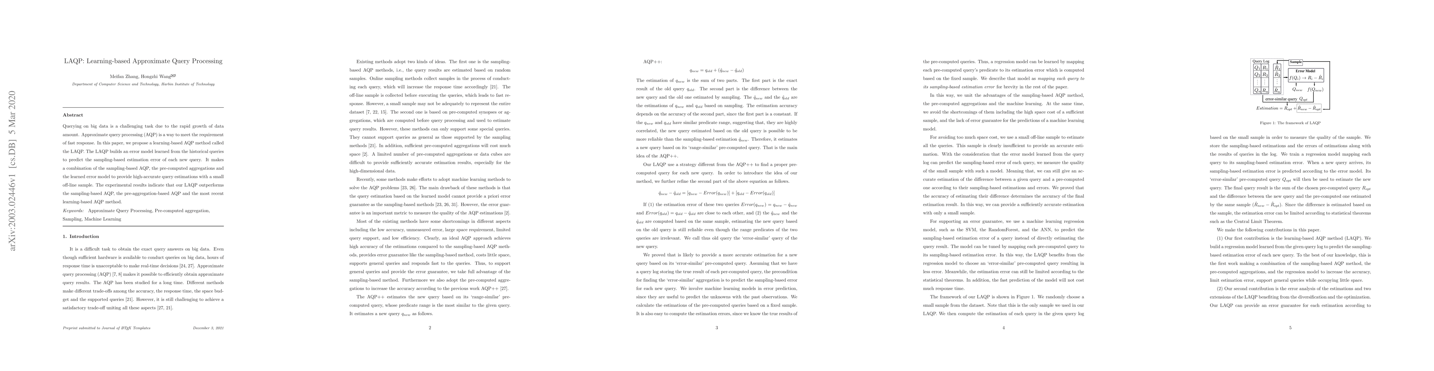 The LAQP method proposes a learning-based approach for approximate query processing on big data, combining sampling, pre-computed aggregations, and a learned error model to achieve high-accuracy query estimations with minimal offline sampling. Experimental results show LAQP outperforms existing sampling-based, pre-aggregation-based, and other learning-based AQP methods.