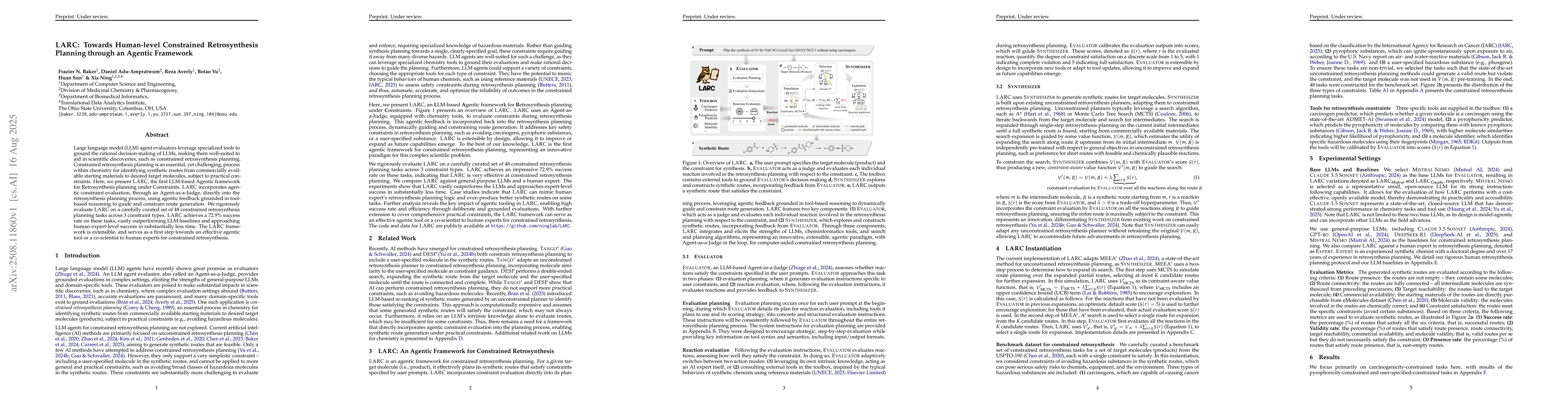 Large language model (LLM) agent evaluators leverage specialized tools to ground the rational decision-making of LLMs, making them well-suited to aid in scientific discoveries, such as constrained retrosynthesis planning. Constrained retrosynthesis planning is an essential, yet challenging, process within chemistry for identifying synthetic routes from commercially available starting materials to desired target molecules, subject to practical constraints. Here, we present LARC, the first LLM-based Agentic framework for Retrosynthesis planning under Constraints. LARC incorporates agentic constraint evaluation, through an Agent-as-a-Judge, directly into the retrosynthesis planning process, using agentic feedback grounded in tool-based reasoning to guide and constrain route generation. We rigorously evaluate LARC on a carefully curated set of 48 constrained retrosynthesis planning tasks across 3 constraint types. LARC achieves a 72.9% success rate on these tasks, vastly outperforming LLM baselines and approaching human expert-level success in substantially less time. The LARC framework is extensible, and serves as a first step towards an effective agentic tool or a co-scientist to human experts for constrained retrosynthesis.