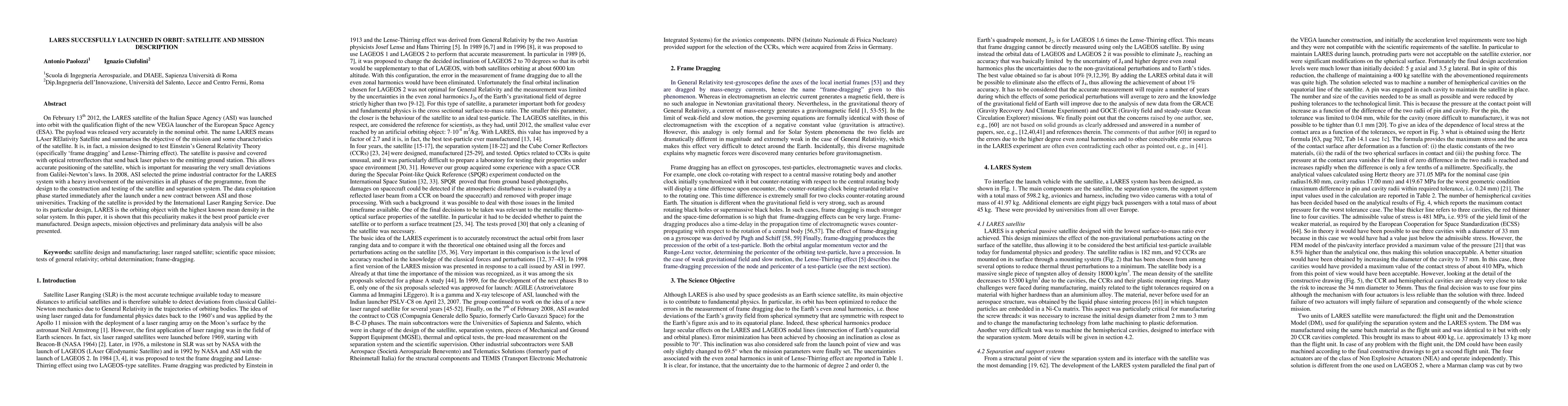 On February 13th 2012, the LARES satellite of the Italian Space Agency (ASI) was launched into orbit with the qualification flight of the new VEGA launcher of the European Space Agency (ESA). The payload was released very accurately in the nominal orbit. The name LARES means LAser RElativity Satellite and summarises the objective of the mission and some characteristics of the satellite. It is, in fact, a mission designed to test Einstein's General Relativity Theory (specifically 'frame dragging' and Lense-Thirring effect). The satellite is passive and covered with optical retroreflectors that send back laser pulses to the emitting ground station. This allows accurate positioning of the satellite, which is important for measuring the very small deviations from Galilei-Newton's laws. In 2008, ASI selected the prime industrial contractor for the LARES system with a heavy involvement of the universities in all phases of the programme, from the design to the construction and testing of the satellite and separation system. The data exploitation phase started immediately after the launch under a new contract between ASI and those universities. Tracking of the satellite is provided by the International Laser Ranging Service. Due to its particular design, LARES is the orbiting object with the highest known mean density in the solar system. In this paper, it is shown that this peculiarity makes it the best proof particle ever manufactured. Design aspects, mission objectives and preliminary data analysis will be also presented.
