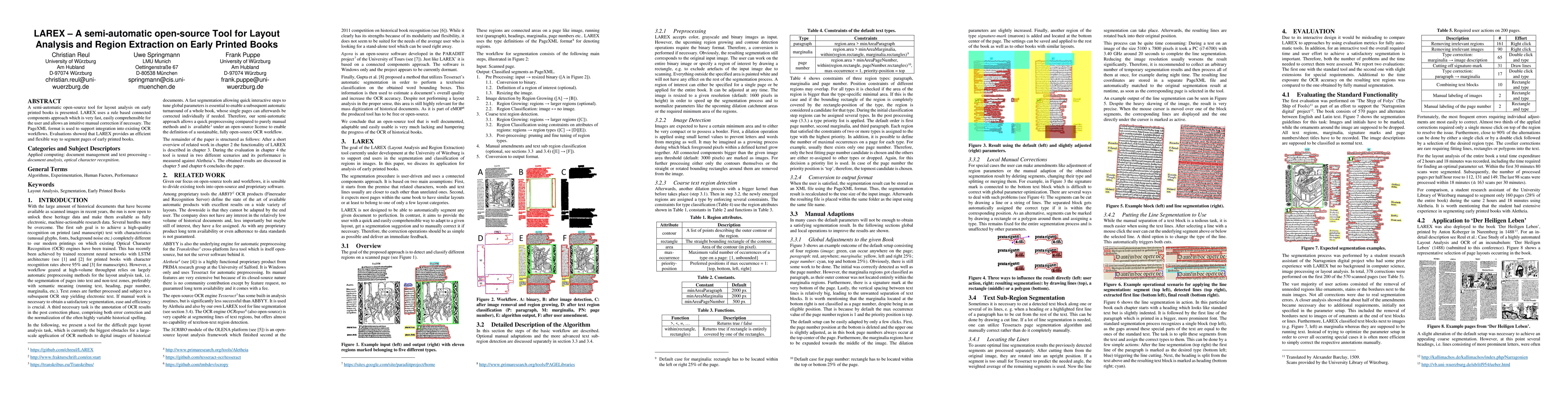 A semi-automatic open-source tool for layout analysis on early printed books is presented. LAREX uses a rule based connected components approach which is very fast, easily comprehensible for the user and allows an intuitive manual correction if necessary. The PageXML format is used to support integration into existing OCR workflows. Evaluations showed that LAREX provides an efficient and flexible way to segment pages of early printed books.