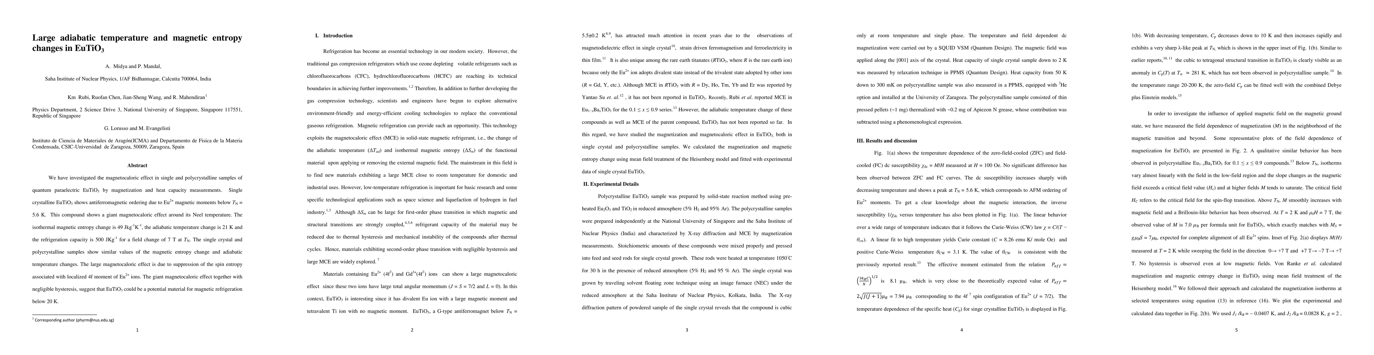 This study investigates the magnetocaloric effect in EuTiO3, revealing a giant magnetocaloric effect with an isothermal magnetic entropy change of 49 Jkg⁻¹K⁻¹ and an adiabatic temperature change of 21 K. EuTiO3 shows potential for magnetic refrigeration applications due to its large effect and negligible hysteresis.