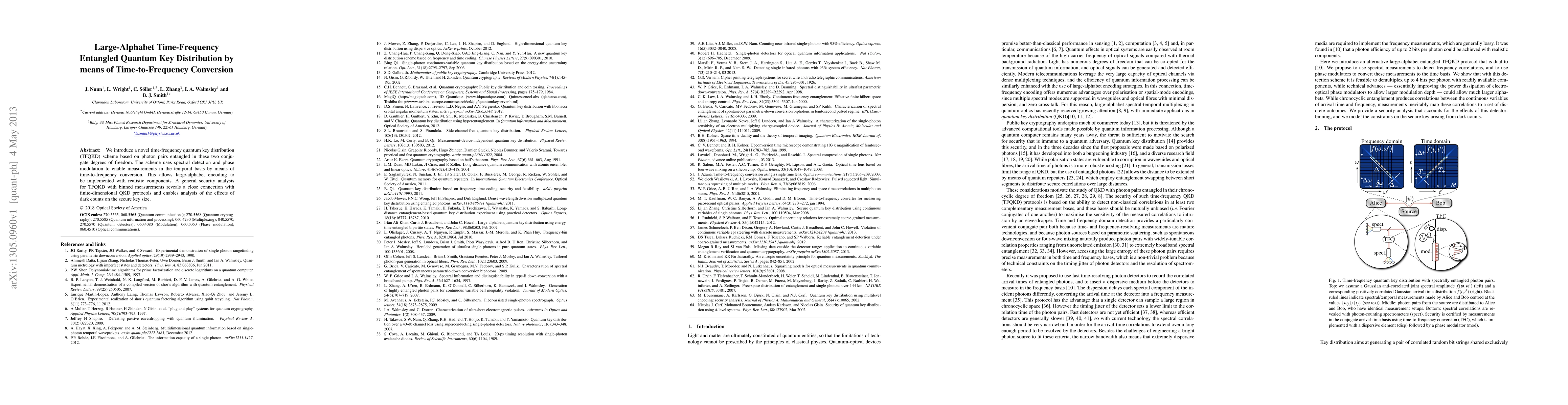 We introduce a novel time-frequency quantum key distribution (TFQKD) scheme based on photon pairs entangled in these two conjugate degrees of freedom. The scheme uses spectral detection and phase modulation to enable measurements in the temporal basis by means of time-to-frequency conversion. This allows large-alphabet encoding to be implemented with realistic components. A general security analysis for TFQKD with binned measurements reveals a close connection with finite-dimensional QKD protocols and enables analysis of the effects of dark counts on the secure key size.