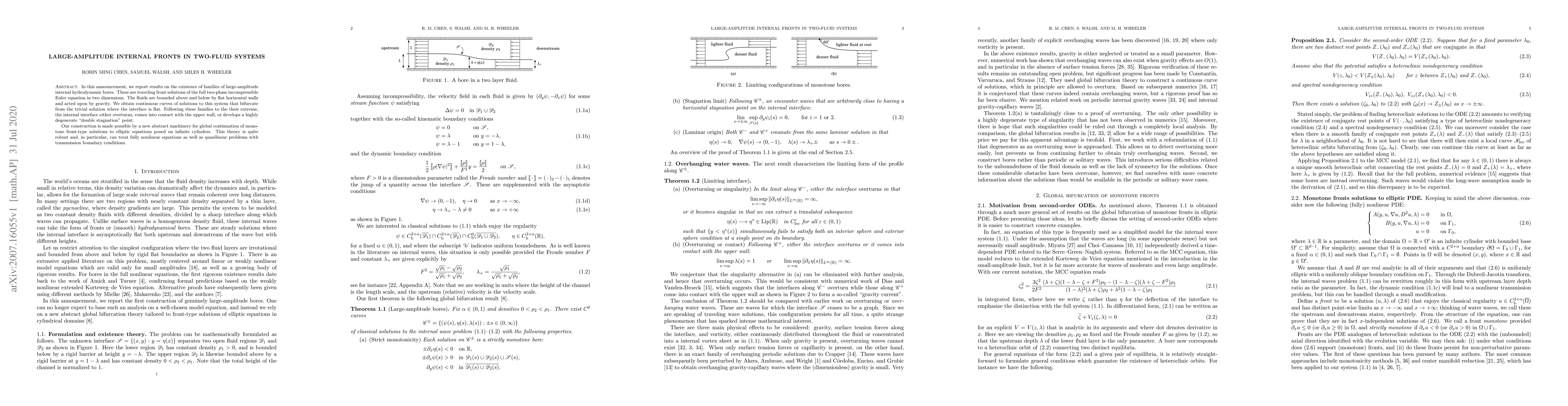In this announcement, we report results on the existence of families of large-amplitude internal hydrodynamic bores. These are traveling front solutions of the full two-phase incompressible Euler equation in two dimensions. The fluids are bounded above and below by flat horizontal walls and acted upon by gravity. We obtain continuous curves of solutions to this system that bifurcate from the trivial solution where the interface is flat. Following these families to the their extreme, the internal interface either overturns, comes into contact with the upper wall, or develops a highly degenerate "double stagnation" point. Our construction is made possible by a new abstract machinery for global continuation of monotone front-type solutions to elliptic equations posed on infinite cylinders. This theory is quite robust and, in particular, can treat fully nonlinear equations as well as quasilinear problems with transmission boundary conditions.
