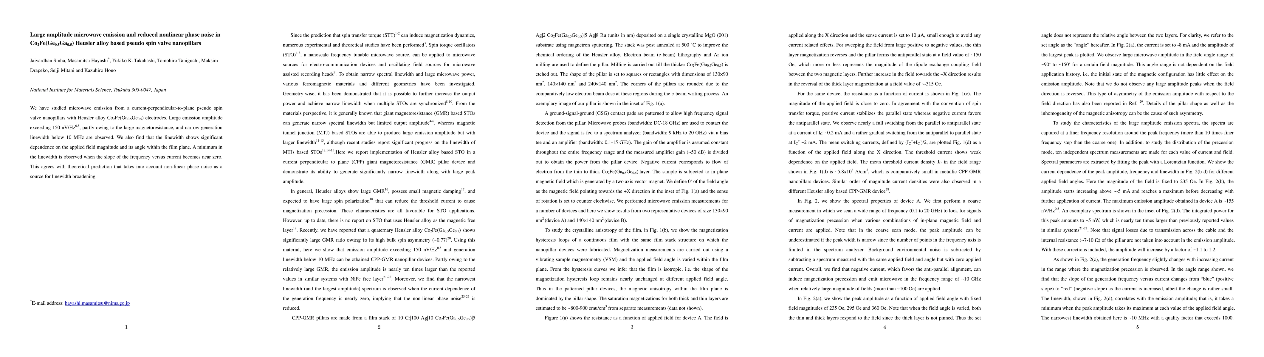 We have studied microwave emission from a current-perpendicular-to-plane pseudo spin valve nanopillars with Heusler alloy Co2Fe(Ga0.5Ge0.5) electrodes. Large emission amplitude exceeding 150 nV/Hz^0.5, partly owing to the large magnetoresistance, and narrow generation linewidth below 10 MHz are observed. We also find that the linewidth shows significant dependence on the applied field magnitude and its angle within the film plane. A minimum in the linewidth is observed when the slope of the frequency versus current becomes near zero. This agrees with theoretical prediction that takes into account non-linear phase noise as a source for linewidth broadening.