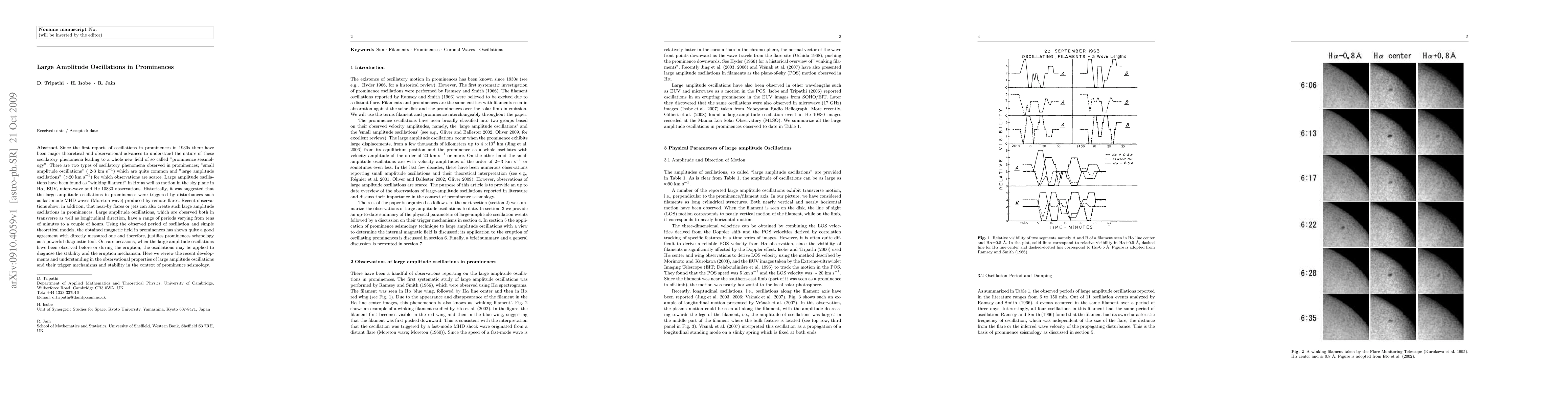 Since the first reports of oscillations in prominences in 1930s there have been major theoretical and observational advances to understand the nature of these oscillatory phenomena leading to a whole new field of so called "prominence seismology". There are two types of oscillatory phenomena observed in prominences; "small amplitude oscillations" (~2-3 km s$^{-1}$) which are quite common and "large amplitude oscillations" ($>$20 km s$^{-1}$) for which observations are scarce. Large amplitude oscillations have been found as "winking filament" in H$\alpha$ as well as motion in the sky plane in H$\alpha$, EUV, micro-wave and He 10830 observations. Historically, it was suggested that the large amplitude oscillations in prominences were triggered by disturbances such as fast-mode MHD waves (Moreton wave) produced by remote flares. Recent observations show, in addition, that near-by flares or jets can also create such large amplitude oscillations in prominences. Large amplitude oscillations, which are observed both in transverse as well as longitudinal direction, have a range of periods varying from tens of minutes to a couple of hours. Using the observed period of oscillation and simple theoretical models, the obtained magnetic field in prominences has shown quite a good agreement with directly measured one and therefore, justifies prominences seismology as a powerful diagnostic tool. On rare occasions, when the large amplitude oscillations have been observed before or during the eruption, the oscillations may be applied to diagnose the stability and the eruption mechanism. Here we review the recent developments and understanding in the observational properties of large amplitude oscillations and their trigger mechanisms and stability in the context of prominence seismology.