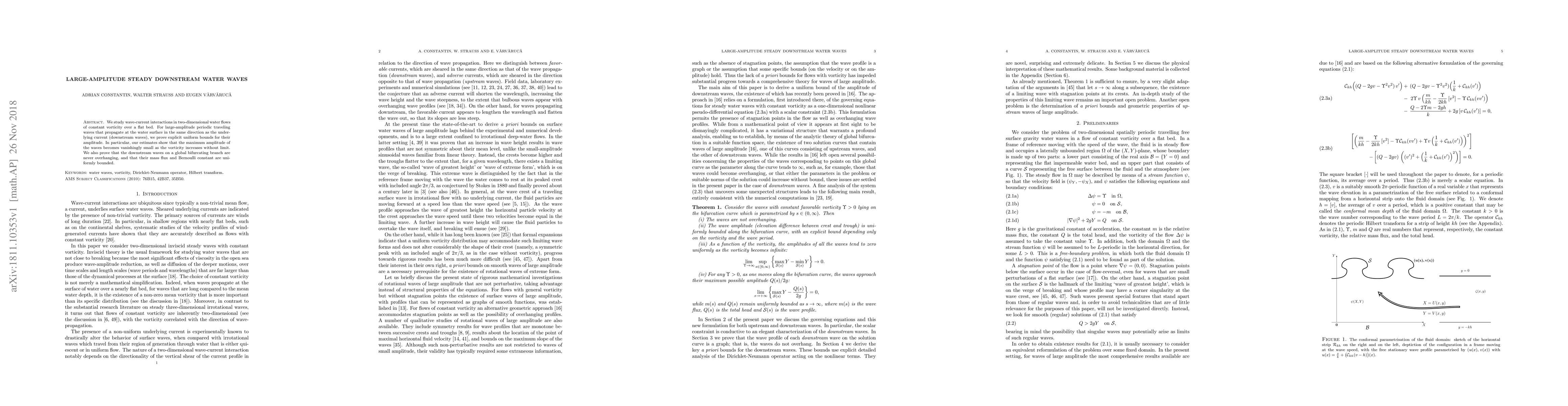 This paper investigates wave-current interactions in two-dimensional water flows, proving uniform bounds for the amplitude of large-amplitude downstream waves. It finds that wave amplitude diminishes as vorticity increases and demonstrates that these waves are not overhanging with uniformly bounded mass flux and Bernoulli constant.