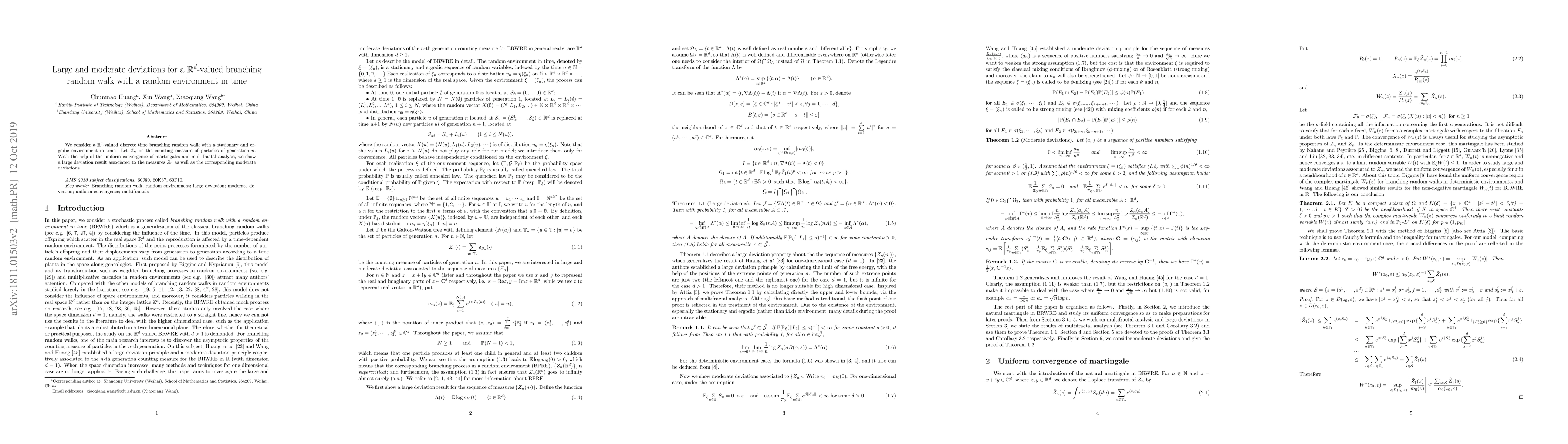 This paper investigates a $\mathbb{R}^d$-valued branching random walk in a stationary and ergodic random environment, establishing large deviation principles and moderate deviation principles for the counting measures of particles across generations using martingale convergence and multifractal analysis.