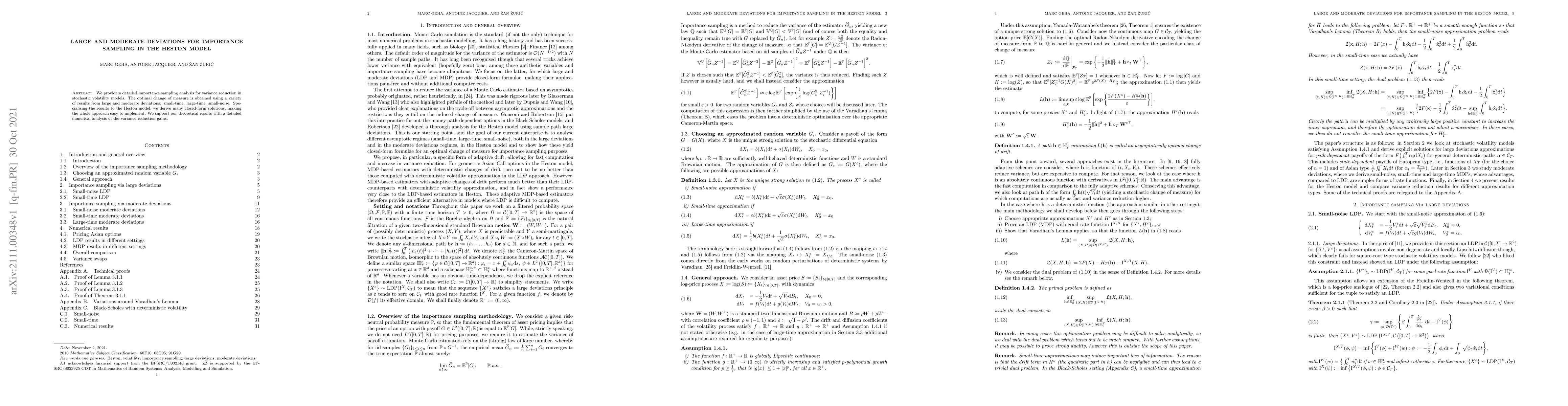 This paper analyzes importance sampling techniques for variance reduction in stochastic volatility models, specifically the Heston model, using large and moderate deviations theory. It derives closed-form solutions and supports theoretical findings with extensive numerical analysis demonstrating significant variance reduction.