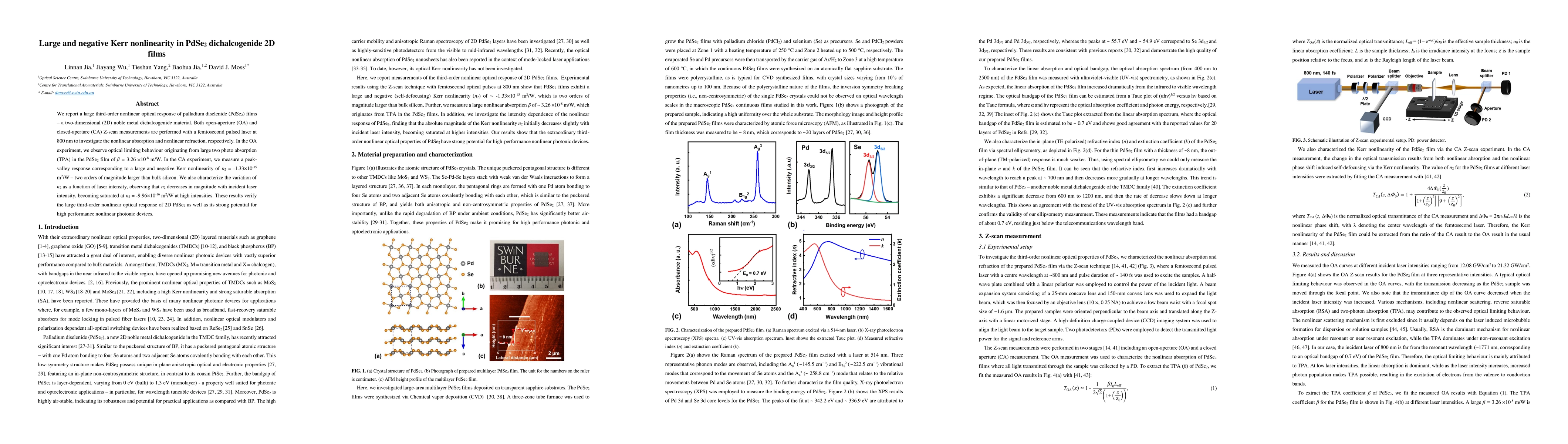 Researchers found a large negative Kerr nonlinearity in PdSe2 dichalcogenide films, with n2 = -1.33 x 10^-15 m^2/W, which is two orders of magnitude larger than bulk silicon, making it suitable for high-performance nonlinear photonic devices.