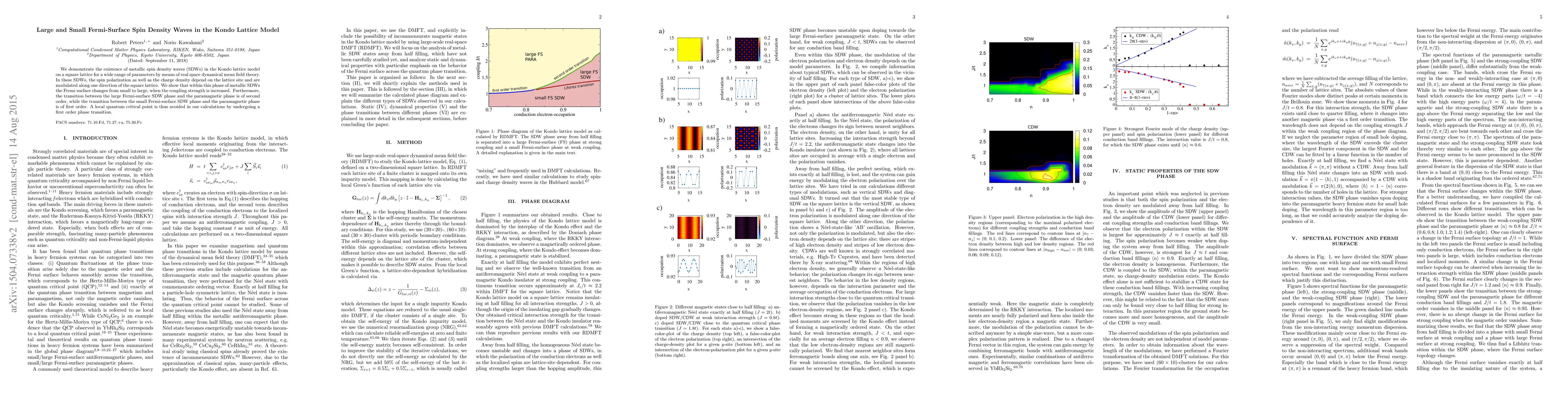 This study reveals metallic spin density waves in the Kondo lattice model using real space dynamical mean field theory, showing that the Fermi surface transitions from small to large with increased coupling strength. The transition to the large Fermi-surface phase is second-order, while the small Fermi-surface phase transition is first-order, avoiding a local quantum critical point.