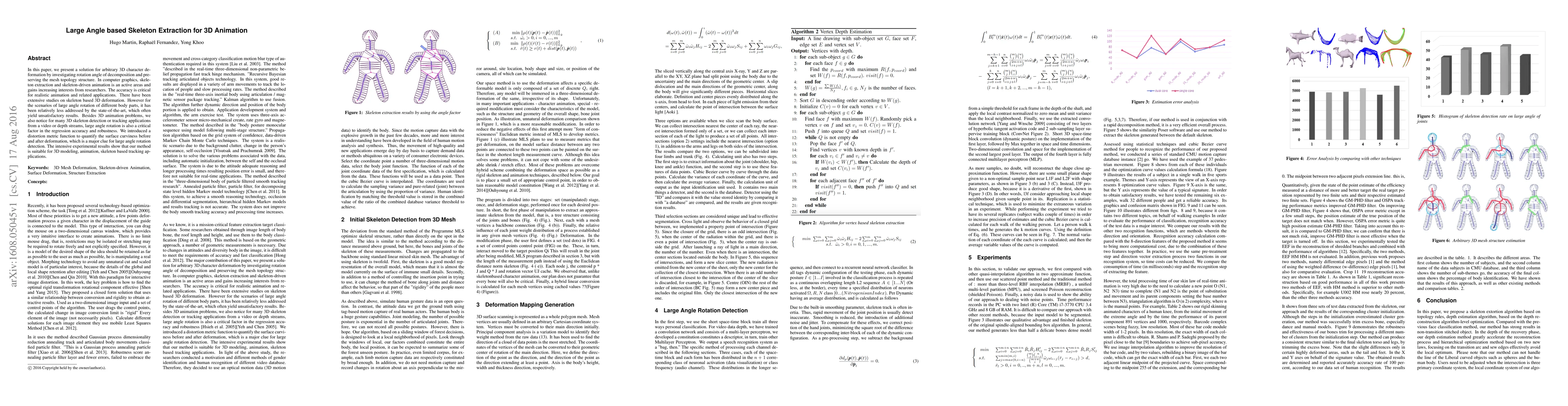 This paper proposes a method for extracting skeletons from 3D characters to enable accurate deformation during large angle rotations, addressing limitations in existing techniques. The approach uses a distortion metric to detect large angle rotations and maintain mesh topology, demonstrating effectiveness in 3D animation and skeleton tracking applications.
