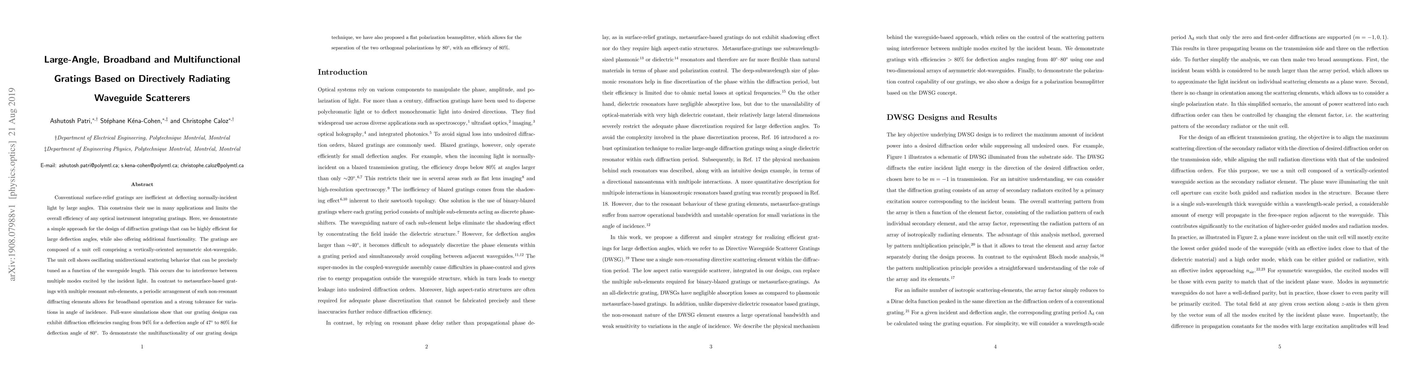 This paper presents a novel design of large-angle, broadband diffraction gratings based on directively radiating waveguide scatterers, achieving high efficiency for large deflection angles and multifunctionality, including polarization beamsplitting. Simulation results show diffraction efficiencies up to 94% for angles up to 80$^\circ$.