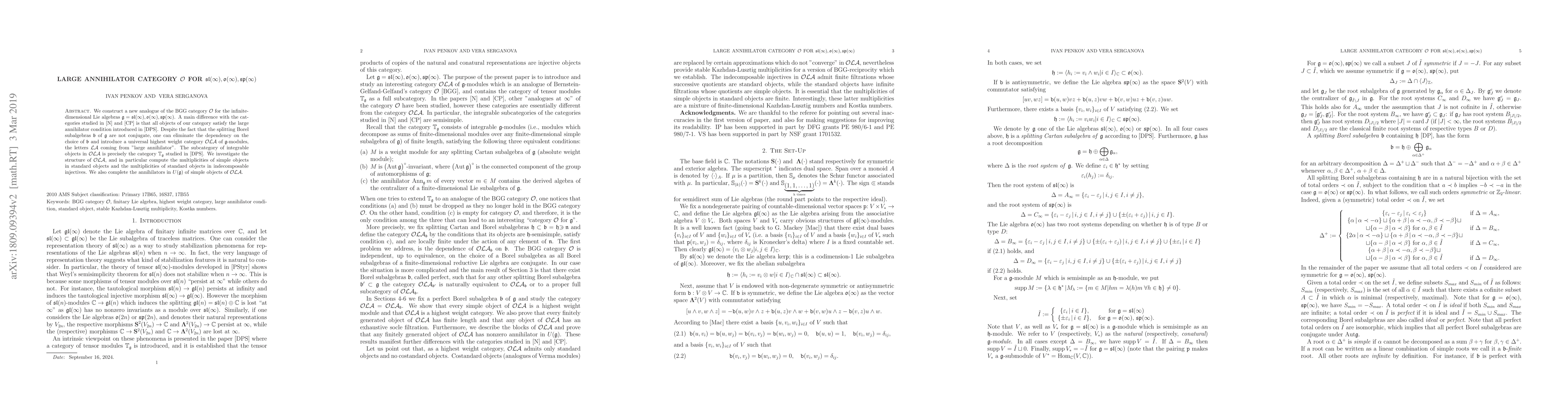 We construct a new analogue of the BGG category $\mathcal O$ for the infinite-dimensional Lie algebras $\fg=\mathfrak{sl}(\infty),\mathfrak{o}(\infty), \mathfrak{sp}(\infty)$. A main difference with the categories studied in \cite{Nam} and \cite{CP} is that all objects of our category satisfy the large annihilator condition introduced in \cite{DPS}. Despite the fact that the splitting Borel subalgebras $\fb$ of $\fg$ are not conjugate, one can eliminate the dependency on the choice of $\fb$ and introduce a universal highest weight category $\mathcal {OLA}$ of $\fg$-modules, the letters $\mathcal{LA}$ coming from "large annihilator". The subcategory of integrable objects in $\mathcal {OLA}$ is precisely the category $\mathbb T_{\fg}$ studied in \cite{DPS}. We investigate the structure of $\mathcal {OLA}$, and in particular compute the multiplicities of simple objects in standard objects and the multiplicities of standard objects in indecomposable injectives.