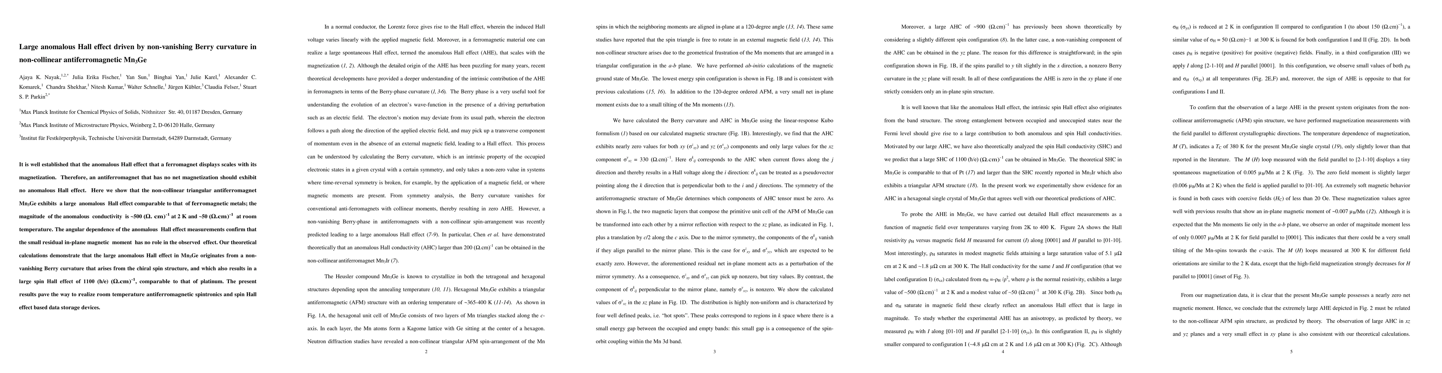 The paper demonstrates that Mn3Ge, a non-collinear antiferromagnet, exhibits a large anomalous Hall effect despite lacking net magnetization, due to a non-vanishing Berry curvature from its chiral spin structure. This discovery could enable room temperature antiferromagnetic spintronics and spin Hall effect-based data storage.