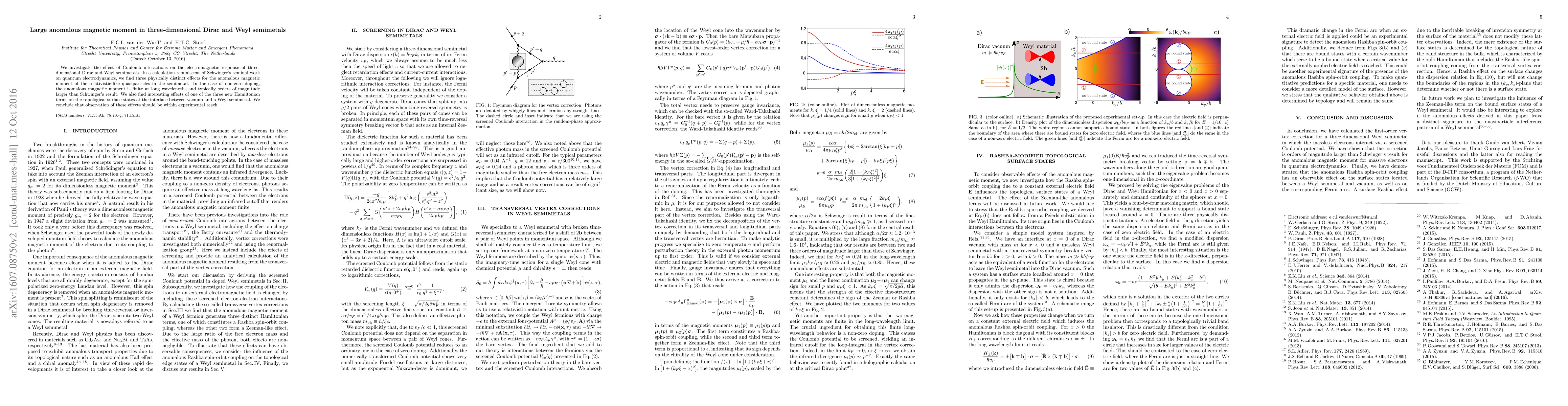 This paper investigates Coulomb interactions' impact on the electromagnetic response in three-dimensional Dirac and Weyl semimetals, revealing a significantly larger anomalous magnetic moment than predicted by Schwinger's quantum electrodynamics. The study also identifies new Hamiltonian terms affecting topological surface states, suggesting these phenomena are experimentally observable.