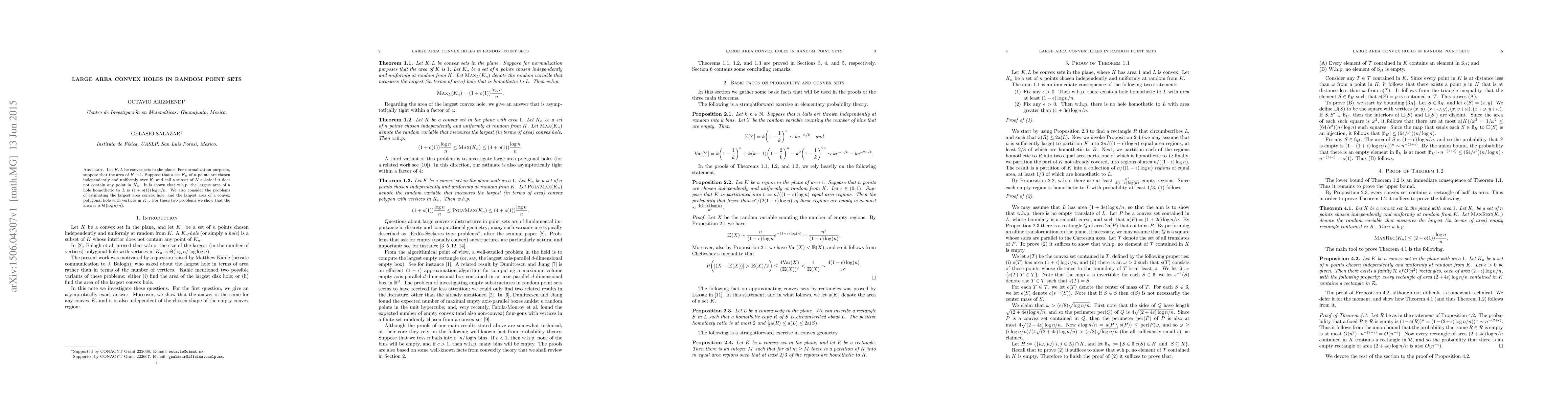 This paper investigates the largest convex holes in random point sets, demonstrating that the largest area of a homothetic hole scales as $(1+o(1)) \log{n}/n$ with high probability. It also addresses estimating the largest convex and polygonal holes in such sets, showing both have an area of $\Theta(\log{n}/n)$.