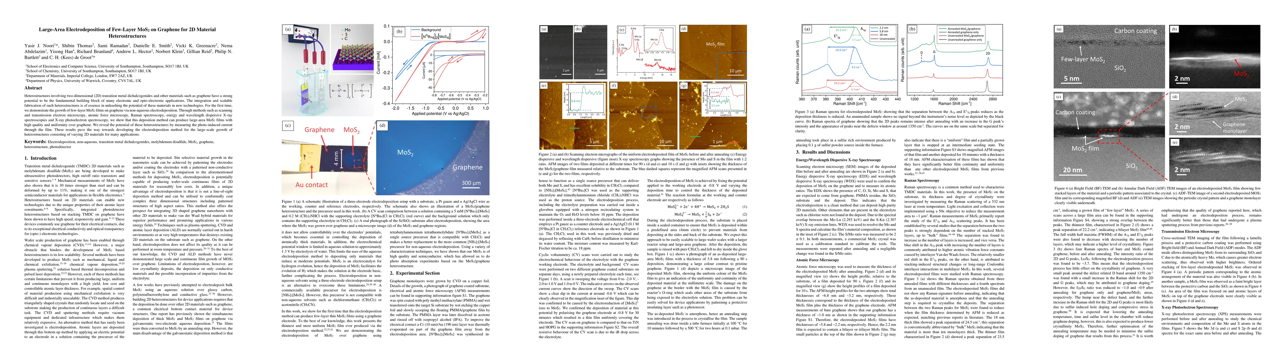 The study presents a scalable method for electrodeposition of high-quality, uniform few-layer MoS2 films on graphene, enabling large-area 2D material heterostructures for potential electronic and opto-electronic applications. The method's effectiveness is demonstrated through comprehensive characterization and photo-induced current measurements.