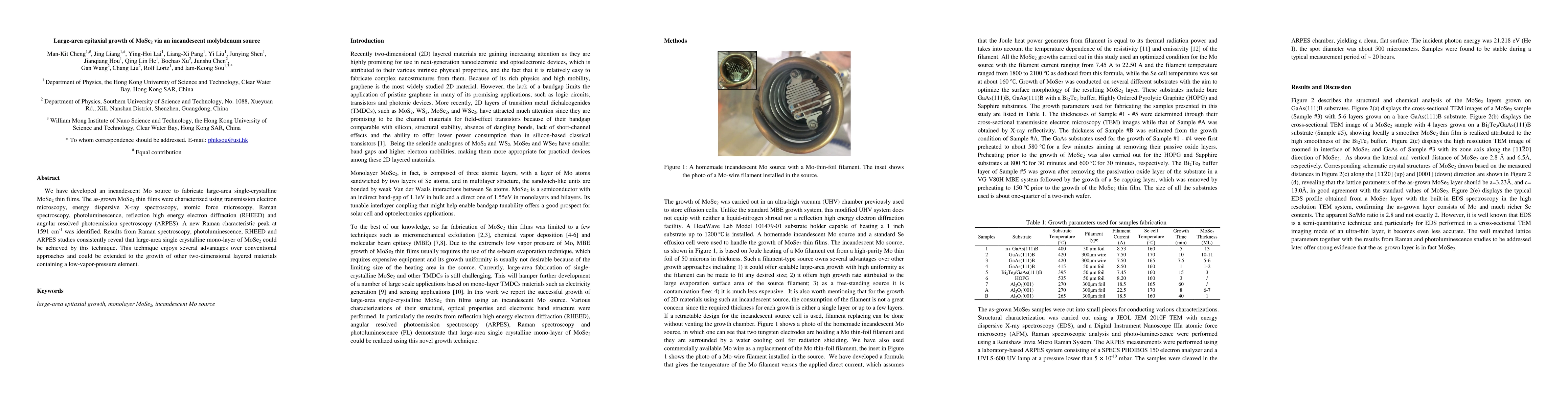 We have developed an incandescent Mo source to fabricate large-area single-crystalline MoSe2 thin films. The as-grown MoSe2 thin films were characterized using transmission electron microscopy, energy dispersive X-ray spectroscopy, atomic force microscopy, Raman spectroscopy, photoluminescence, reflection high energy electron diffraction (RHEED) and angular resolved photoemission spectroscopy (ARPES). A new Raman characteristic peak at 1591 cm-1 was identified. Results from Raman spectroscopy, photoluminescence, RHEED and ARPES studies consistently reveal that large-area single crystalline mono-layer of MoSe2 could be achieved by this technique. This technique enjoys several advantages over conventional approaches and could be extended to the growth of other two-dimensional layered materials containing a low-vapor-pressure element.