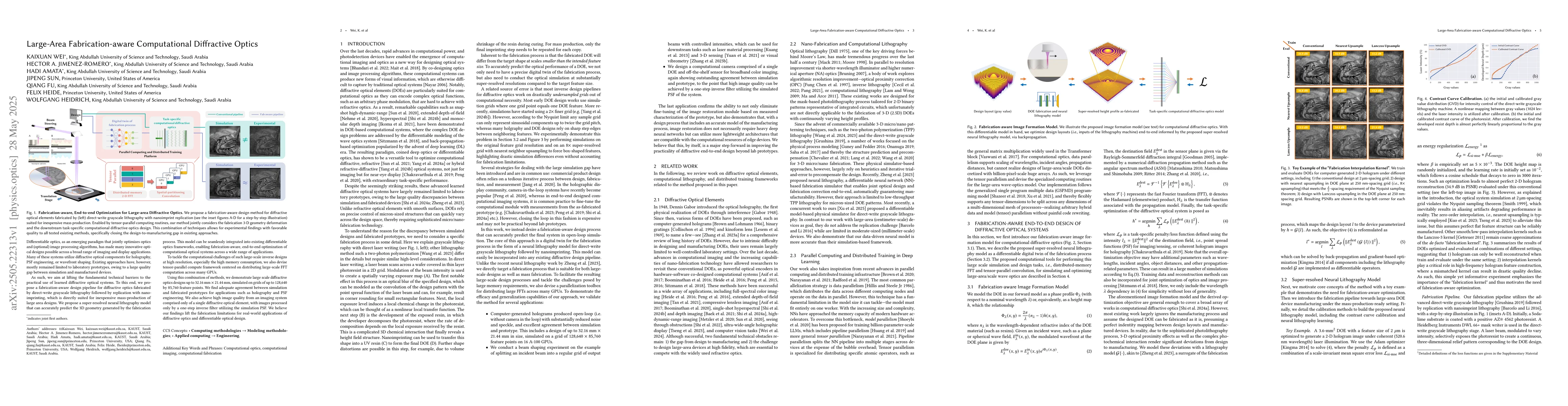 The research proposes a fabrication-aware design pipeline for diffractive optics using direct-write grayscale lithography followed by nano-imprinting replication, suitable for large-area, inexpensive mass production. A super-resolved neural lithography model predicts 3D fabrication geometry, integrated into existing differentiable optics frameworks for end-to-end optimization.