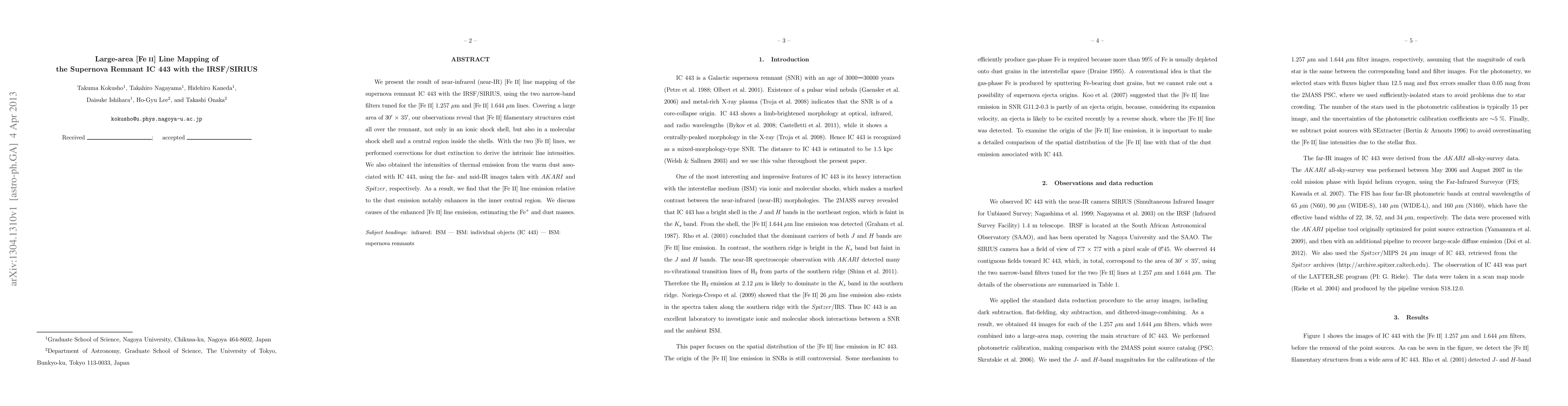 This paper presents large-area near-infrared [Fe II] line mapping of the supernova remnant IC443, revealing filamentary structures throughout the remnant. The study finds enhanced [Fe II] line emission relative to dust emission in the inner central region, suggesting specific physical conditions and estimating Fe+ and dust masses.