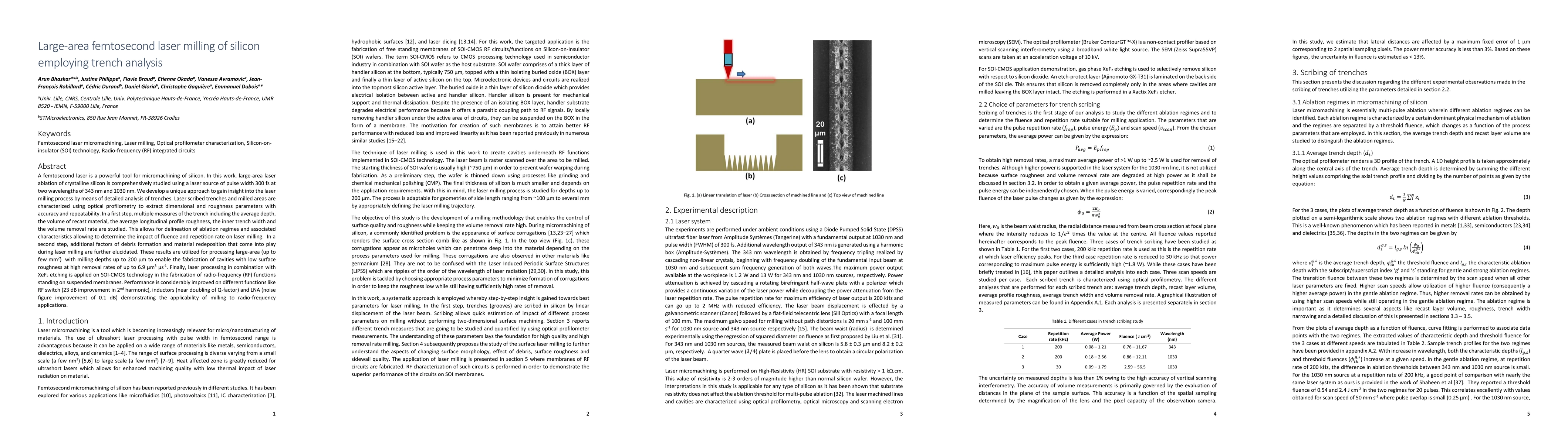 This paper investigates large-area femtosecond laser milling of silicon, analyzing trench characteristics to understand ablation regimes and material redeposition. The study achieves high removal rates and low surface roughness, demonstrating improved RF function performance in SOI-CMOS technology.