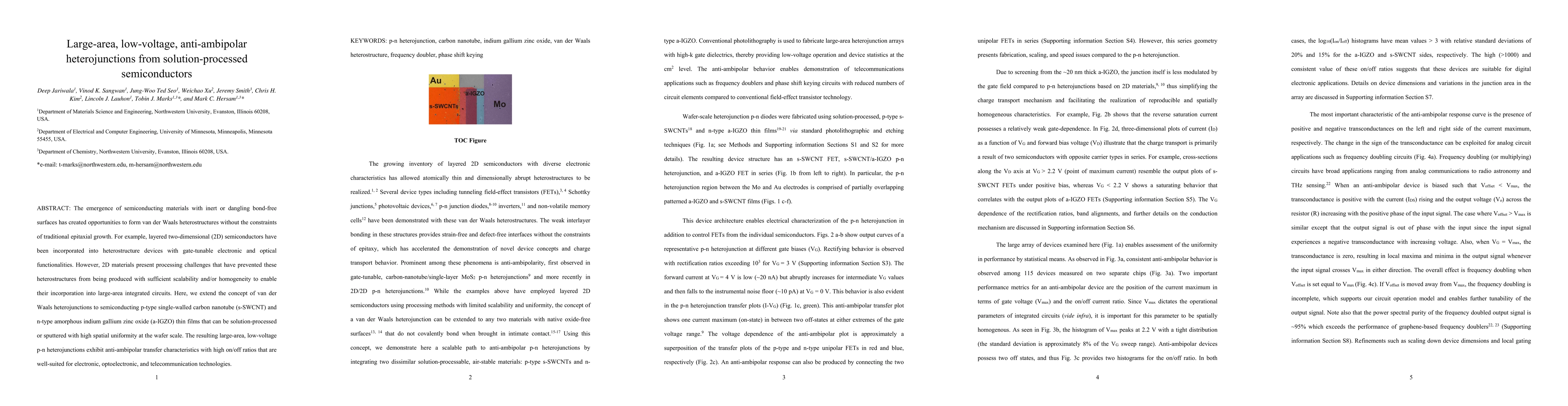 This research develops large-area, low-voltage anti-ambipolar heterojunctions using solution-processed p-type carbon nanotubes and n-type amorphous IGZO films, showcasing scalable, wafer-scale fabrication for advanced electronic and optoelectronic applications. The resulting heterojunctions demonstrate high on/off ratios suitable for next-generation technologies.