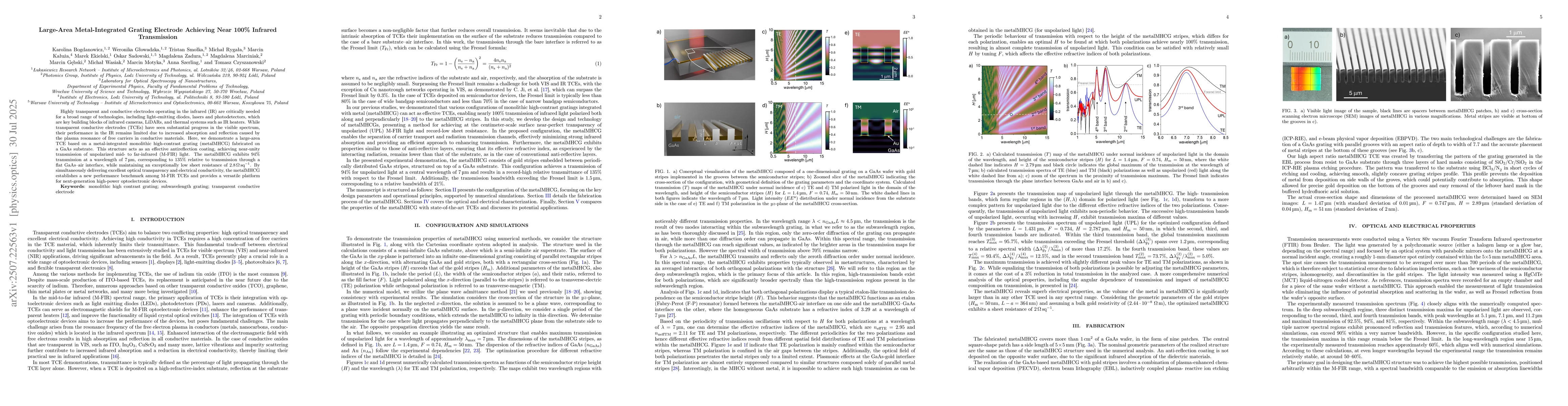 The research demonstrates a large-area transparent conductive electrode (TCE) based on a metal-integrated monolithic high-contrast grating (metalMHCG) fabricated on a GaAs substrate, acting as an effective antireflection coating for mid- to far-infrared (M-FIR) light.