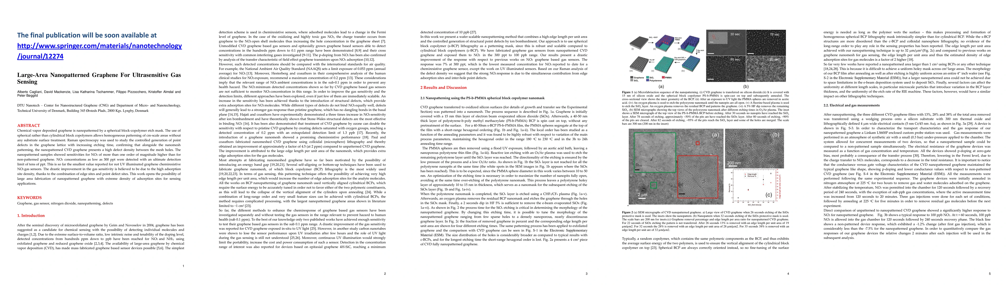 The paper details the creation of large-area nanopatterned graphene using spherical block-copolymers, which enhances gas sensing sensitivity for NO2 by orders of magnitude. The resulting high defect density and adsorption site density allow detection of NO2 at ultralow concentrations, marking a significant advancement in chemiresistive gas sensors.