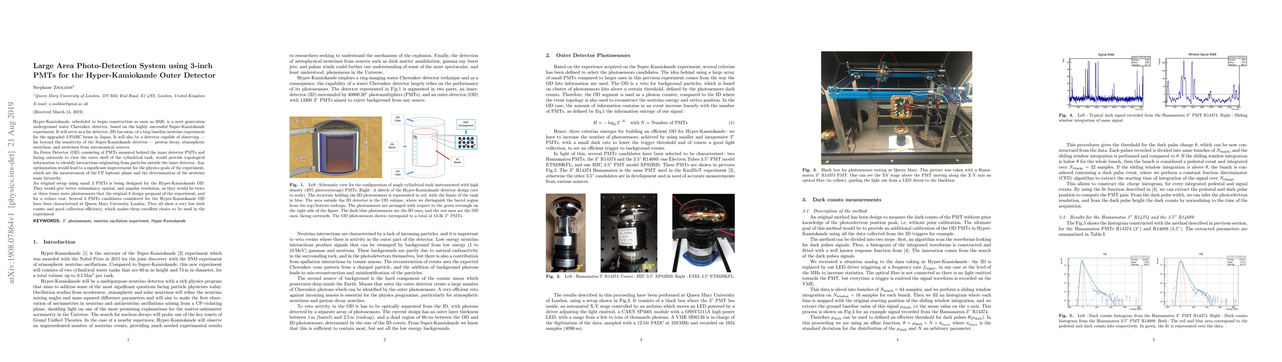 Hyper-Kamiokande, scheduled to begin construction as soon as 2020, is a next generation underground water Cherenkov detector, based on the highly successful Super-Kamiokande experiment. It will serve as a far detector, 295 km away, of a long baseline neutrino experiment for the upgraded J-PARC beam in Japan. It will also be a detector capable of observing --- far beyond the sensitivity of the Super-Kamiokande detector --- proton decay, atmospheric neutrinos, and neutrinos from astronomical sources. An Outer Detector (OD) consisting of PMTs mounted behind the inner detector PMTs and facing outwards to view the outer shell of the cylindrical tank, would provide topological information to identify interactions originating from particles outside the inner detector. Any optimization would lead to a significant improvement for the physics goals of the experiment, which are the measurement of the CP leptonic phase and the determination of the neutrino mass hierarchy. An original setup using small 3" PMTs is being designed for the Hyper-Kamiokande OD. They would give better redundancy, spatial, and angular resolution, as they would be twice or three times more photosensors that the original 8" design proposal of the experiment, and for a reduce cost. Several 3" PMTs candidates considered for the Hyper-Kamiokande OD have been characterized at Queen Mary University London. They all show a very low dark counts and good collection efficiency, which makes them excellent choice to be used in the experiment.