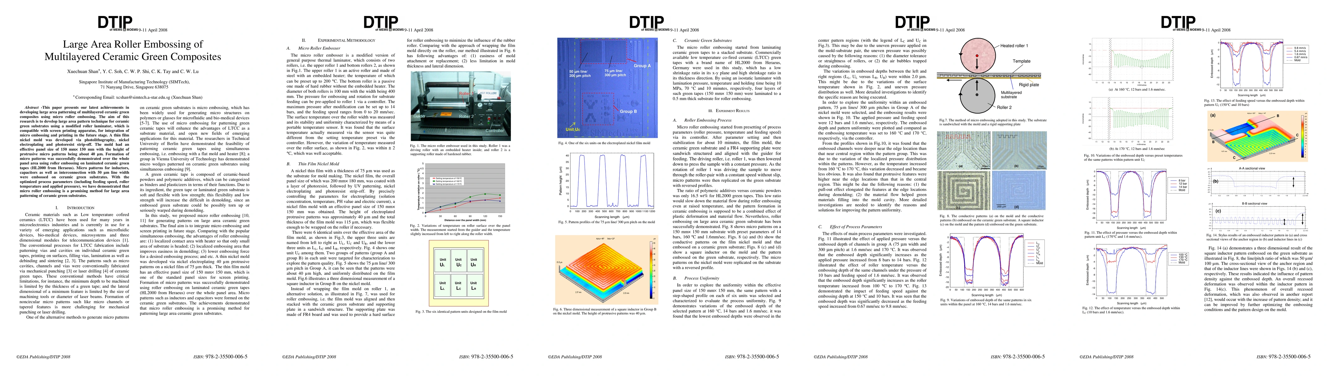 In this paper, we will report our achievements in developing large area patterning of multilayered ceramic green composites using roller embossing. The aim of our research is to pattern large area ceramic green composites using a modified roller laminating apparatus, which is compatible with screen printing machines, for integration of embossing and screen printing. The instrumentation of our roller embossing apparatus, as shown in Figure1, consists of roller 1 and rollers 2. Roller 1 is heated up to the desired embossing temperature ; roller 2 is, however, kept at room temperature. The mould is a nickel template manufactured by plating nickel-based micro patterns (height : 50 $\mu$m) on a nickel film (thickness : 70 $\mu$m) ; the substrate for the roller embossing is a multilayered Heraeus Heralock HL 2000 ceramic green composite. Comparing with the conventional simultaneous embossing, the advantages of roller embossing include : (1) low embossing force ; (2) easiness of demoulding ; (3) localized area in contact with heater ; and etc. We have demonstrated the capability of large area roller embossing with a panel size of 150mmx 150mm on the mentioned substrate. We have explored and confirmed the impact of parameters (feed speed, temperature of roller and applied pressure) to the pattern quality of roller embossing. Furthermore, under the optimized process parameters, we characterized the variations of pattern dimension over the panel area, and calculated a scaling factor in order to make the panel compatible with other processes. Figure 2 shows the embossed patterns on a 150mmx 150mm green ceramic panel.